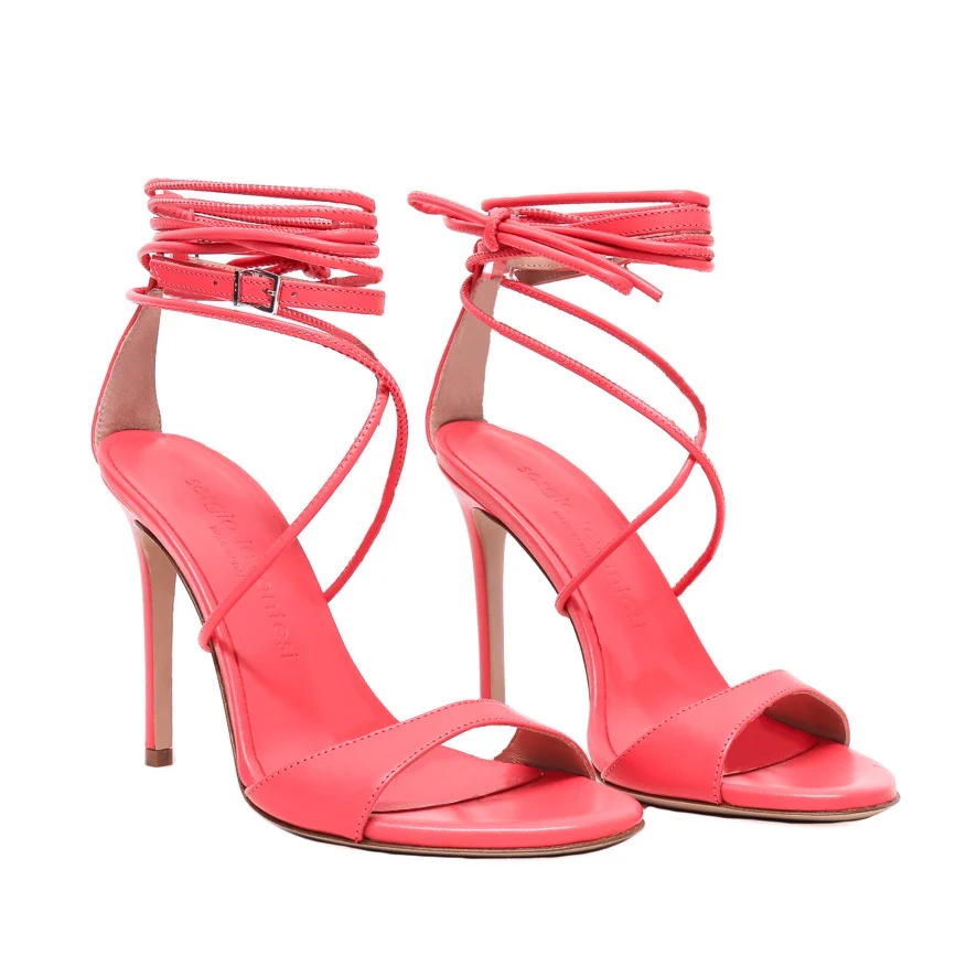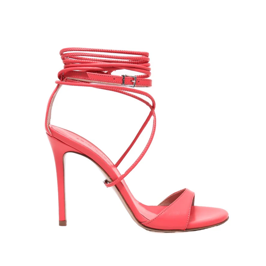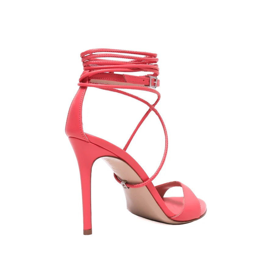 Sandalo in pelle corallo con cinturino alla caviglia e lacci.