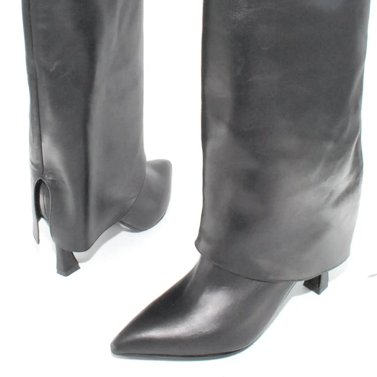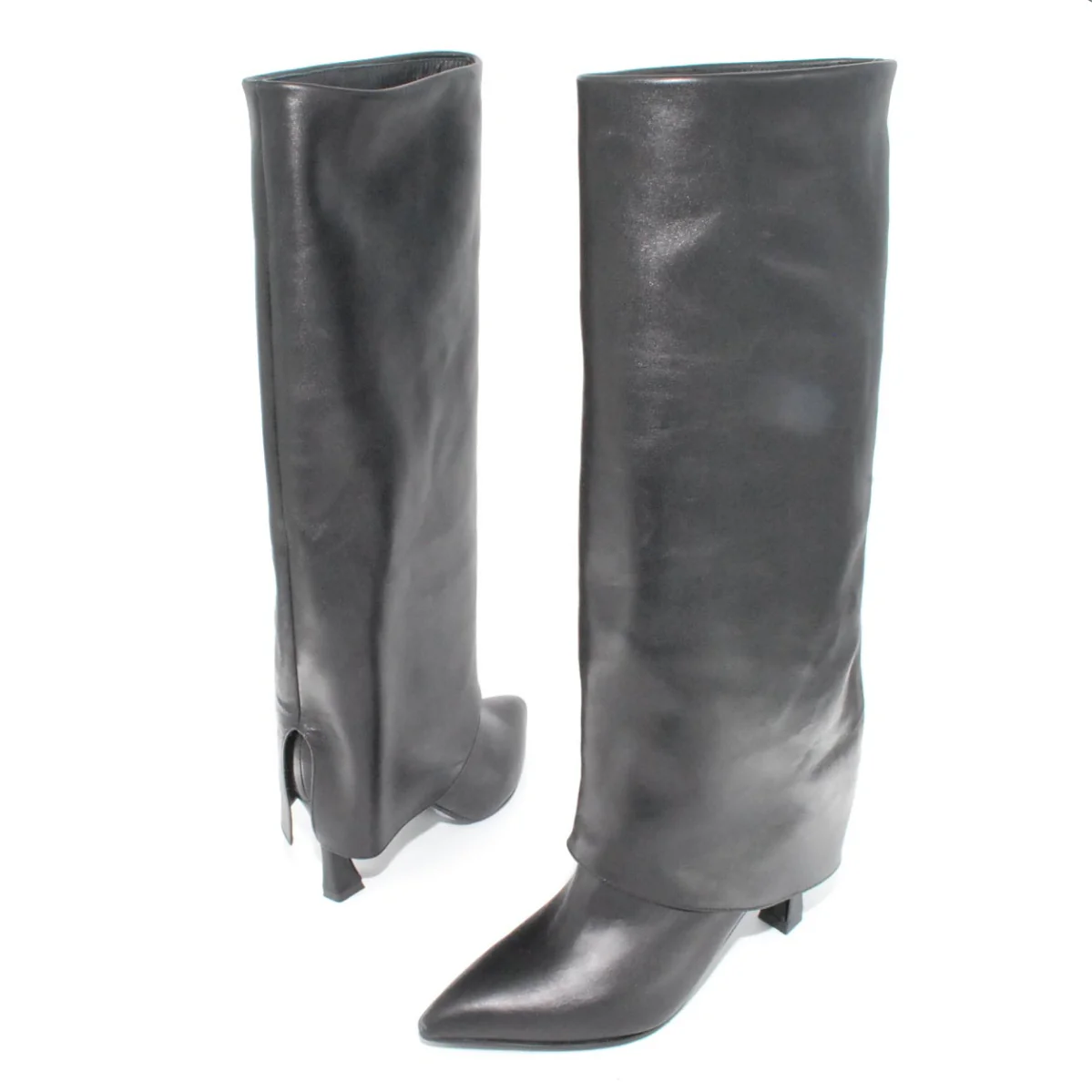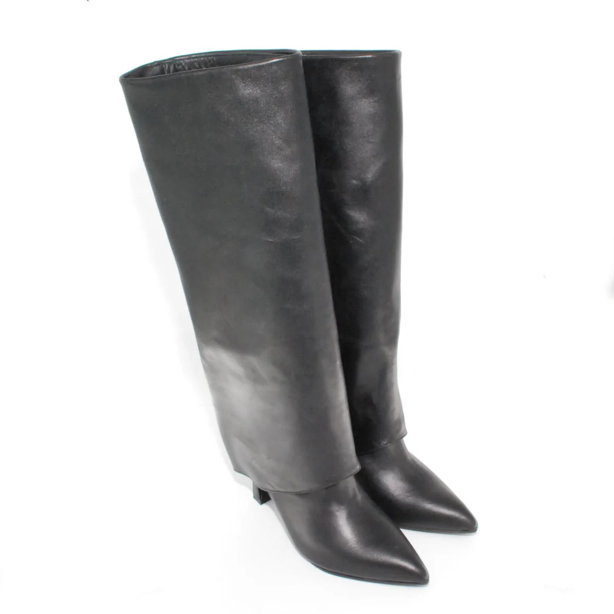 Tomaia in pelle Fodera in pelle Soletta in pelle Suola in gomma antiscivolo Tacco rivestito in pelle Altezza tacco 80 mm Altezza gambale 39 cm Qualitร Artigianale Italiana