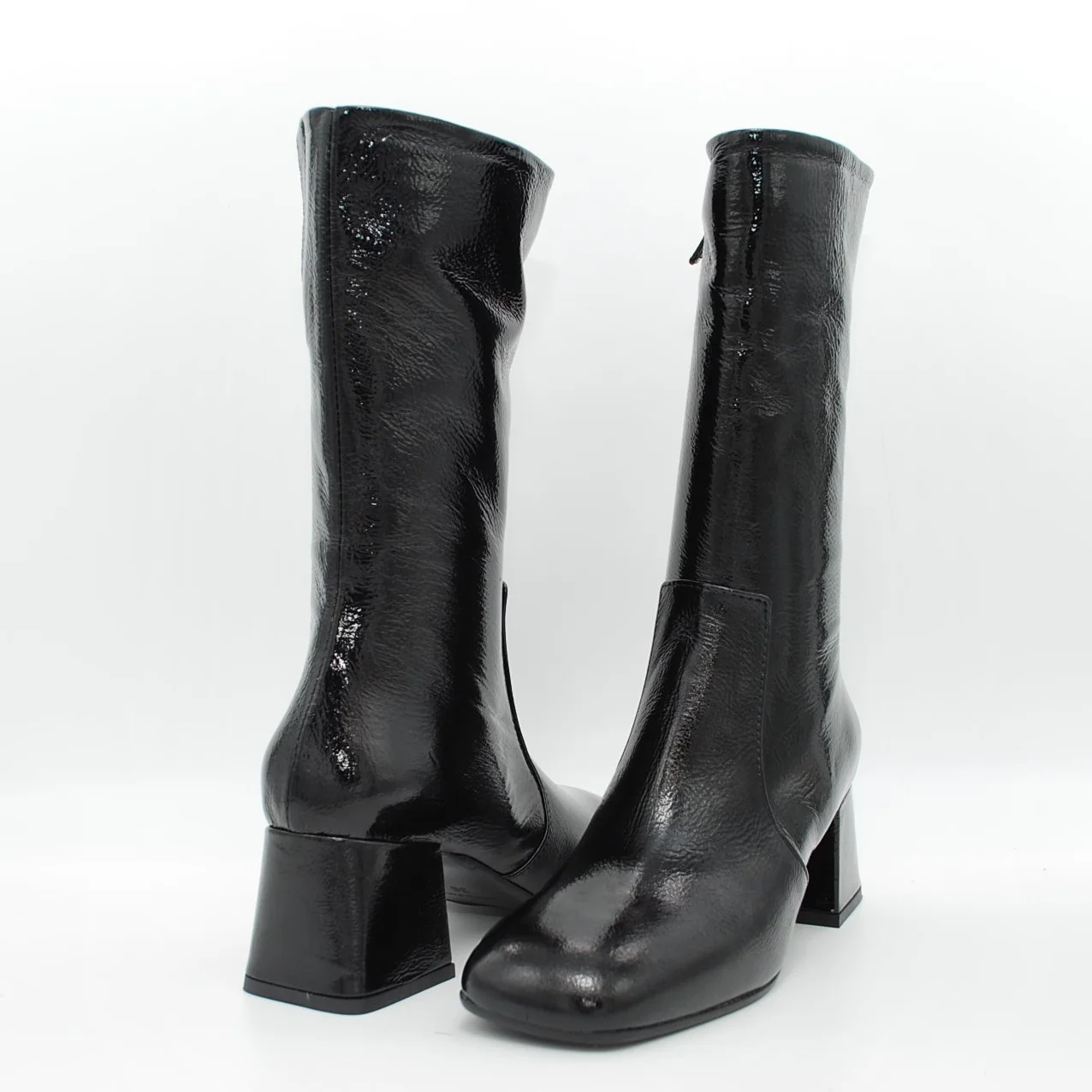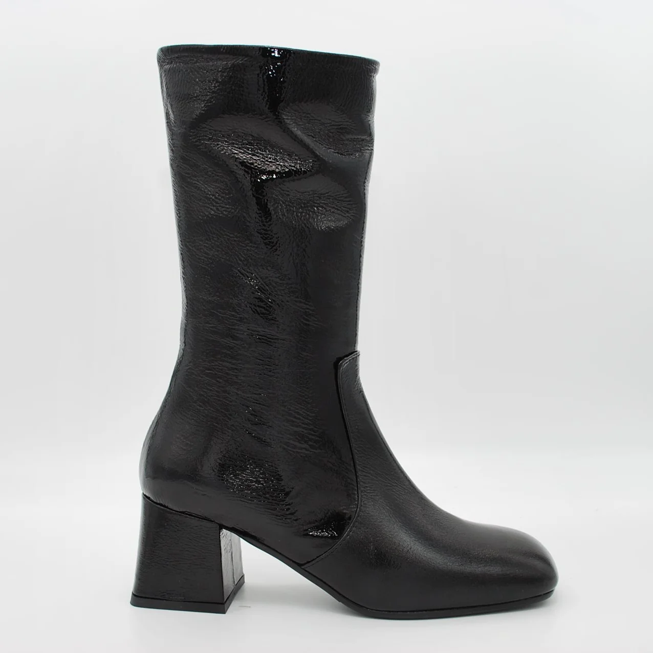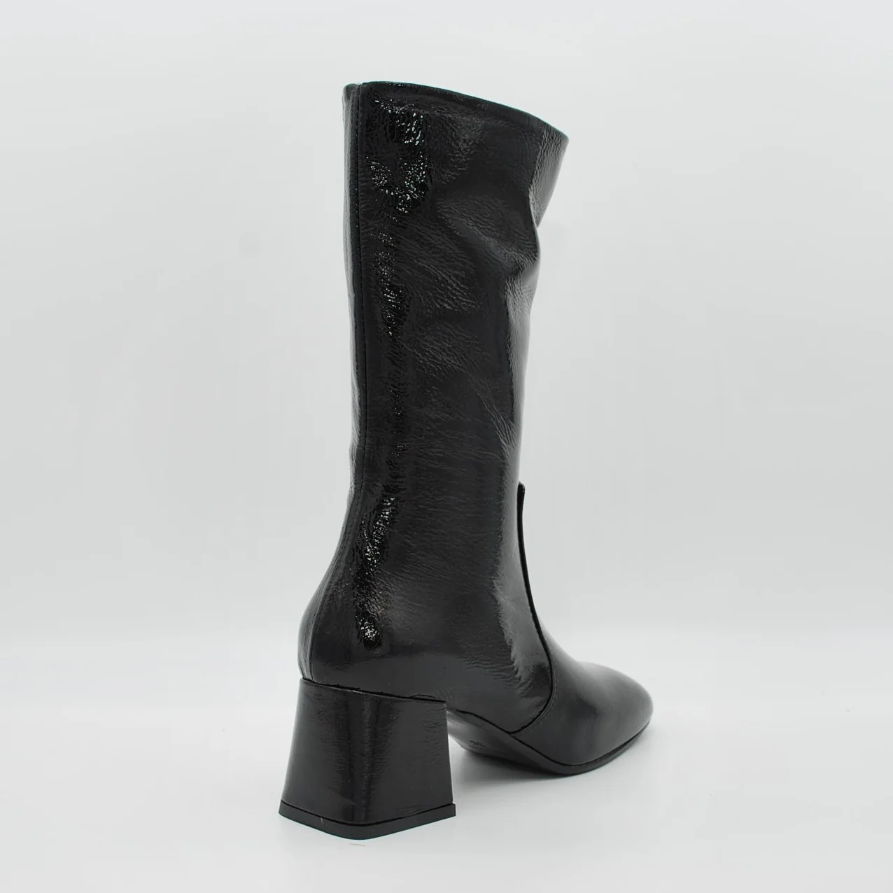 Stivale in pelle verniciata 3/4Fodera in pelleSuoletta imbottita in pellefondo in gomma antiscivolotacco rivestito in pelle 60 mmcerniera laterale Realizzato da artigiani italiani per Nika