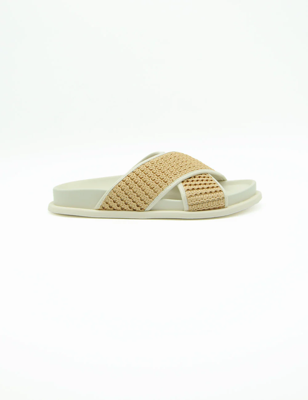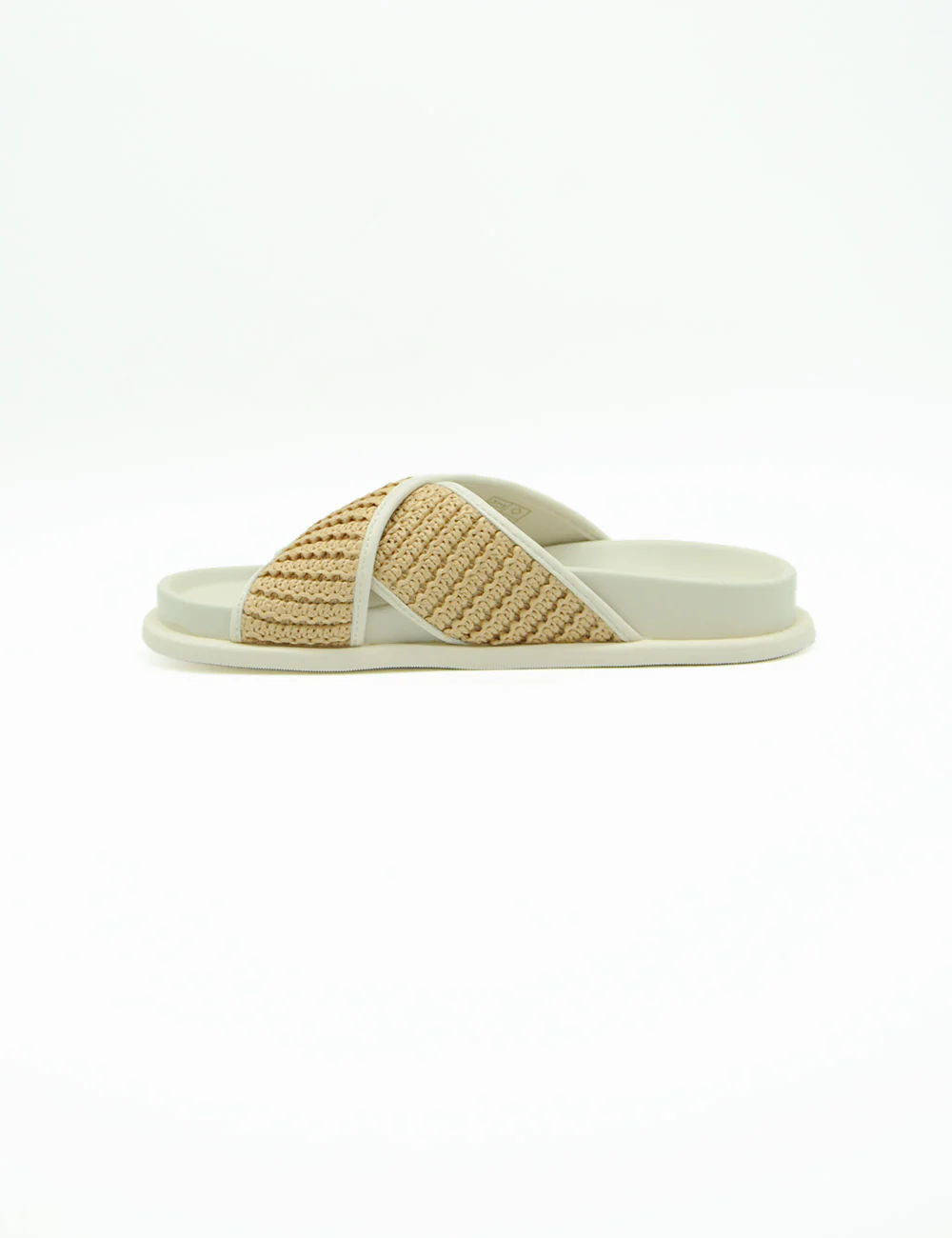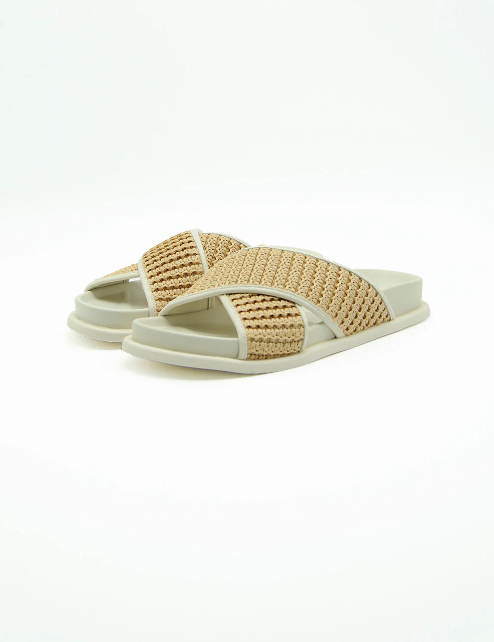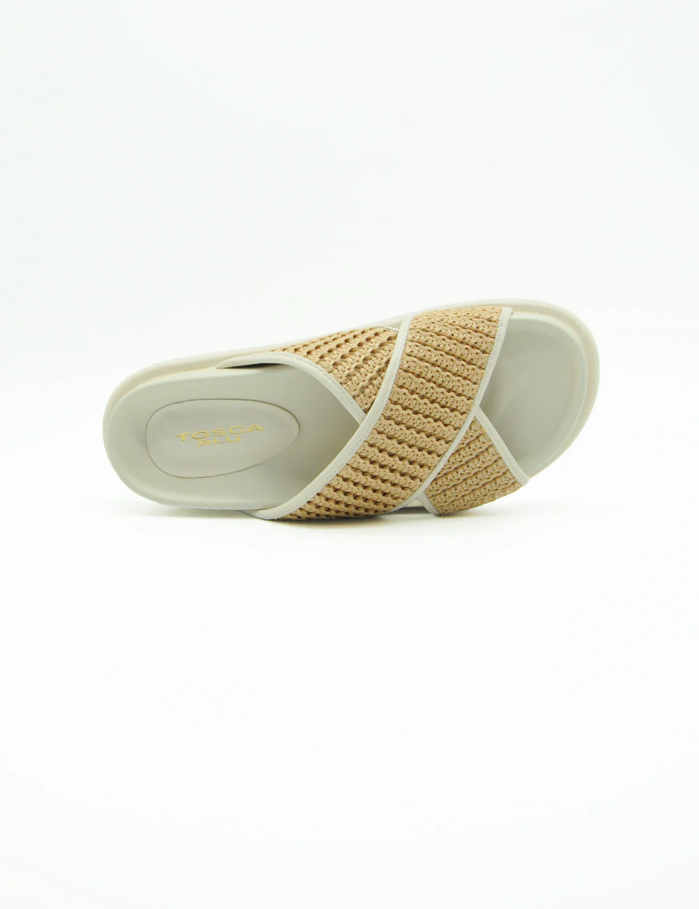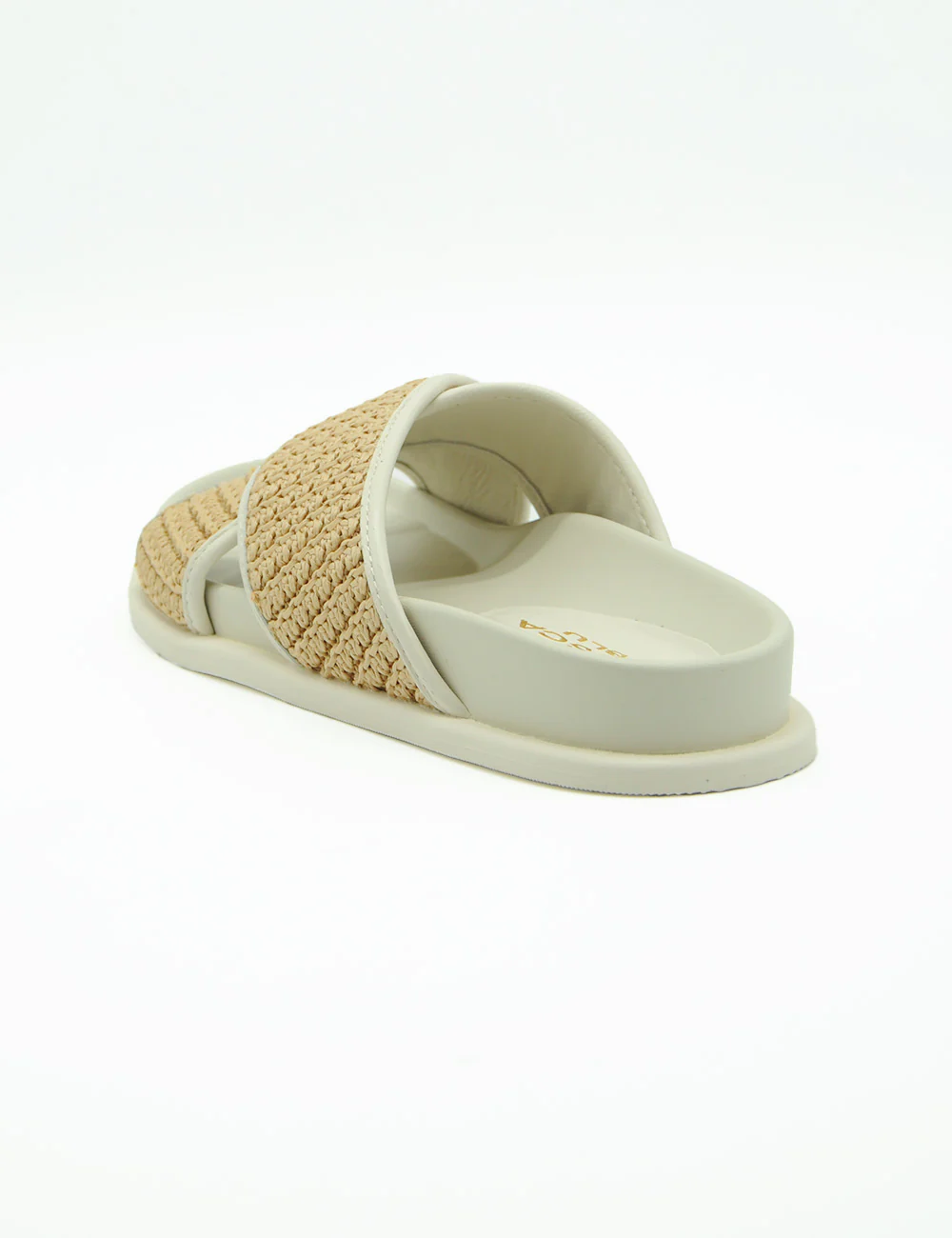 Tosca Blu Ciabatta Tansy Avorio, ciabatta a fasce incrociate realizzate in pelle e raffia. Sottopiede in pelle e fondo in gomma.