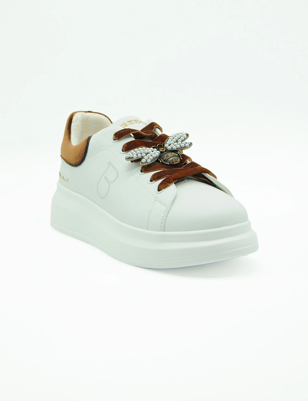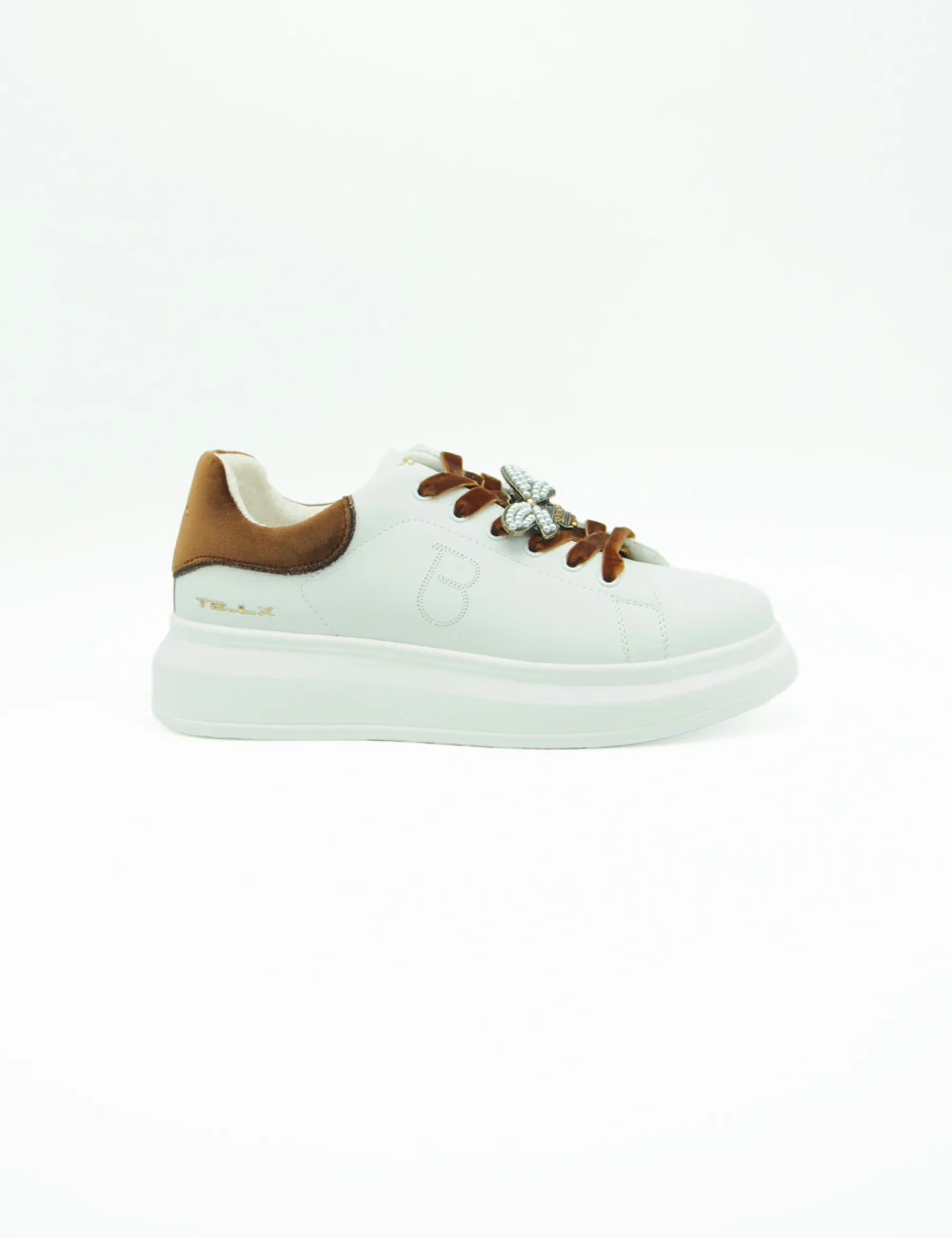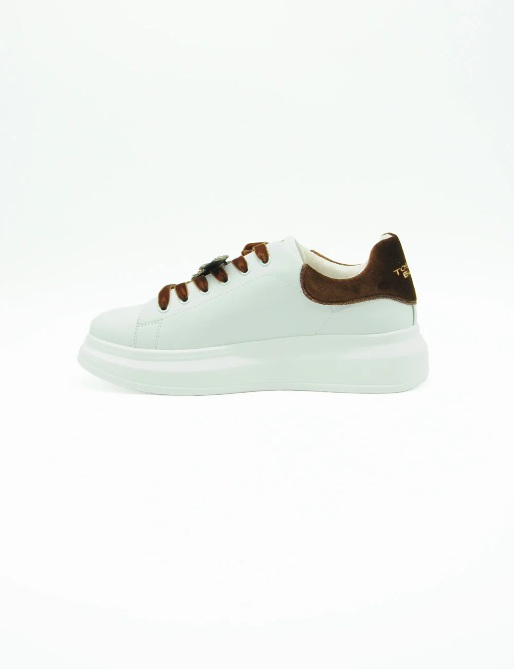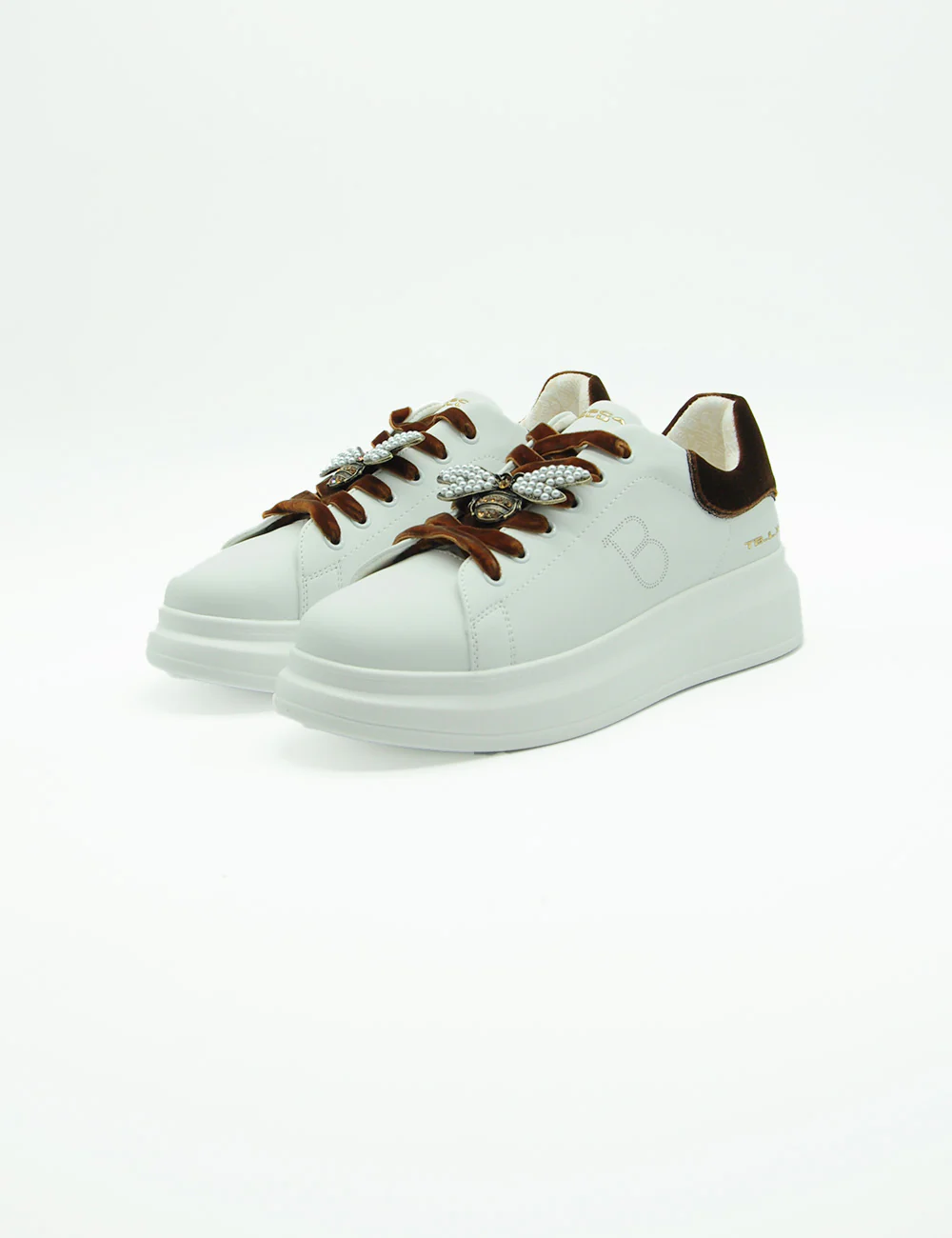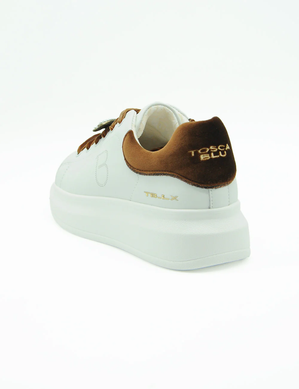 La sneaker Tosca Blu Chic Bianca, realizzata in pelle e con un inserto in velluto, si caratterizza per l’applicazione gioiello sui lacci e la suola platform, alta 4 cm sul tallone e 2 cm sulla punta. Scegliere queste sneaker significa unire eleganza e comfort in modo distintivo.