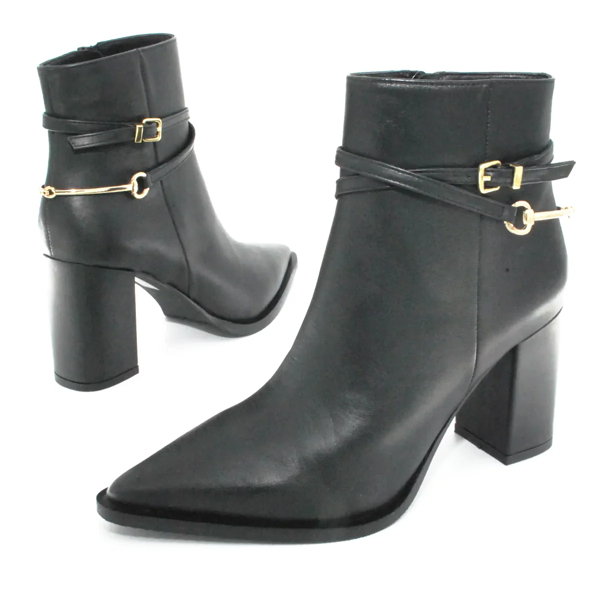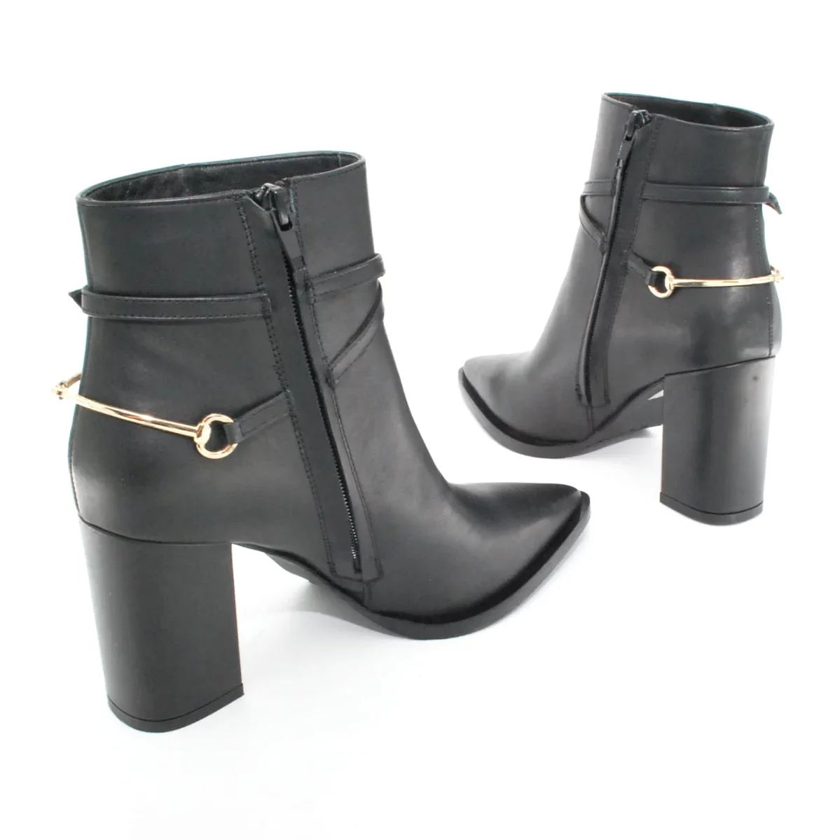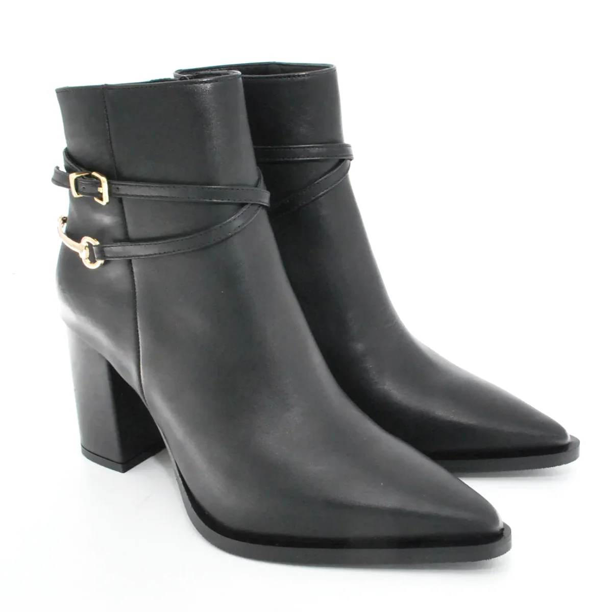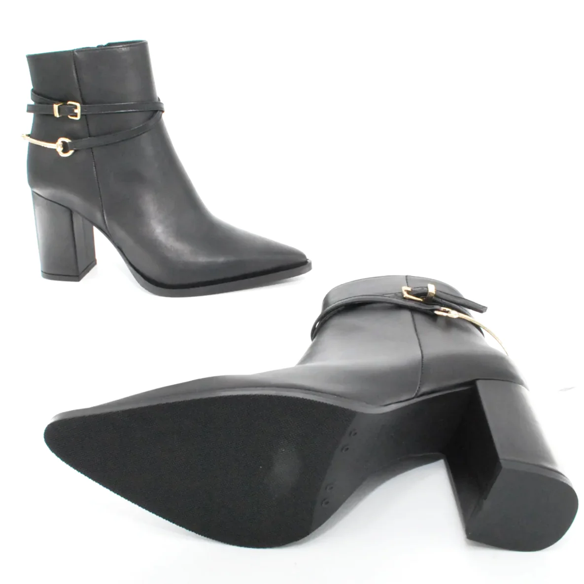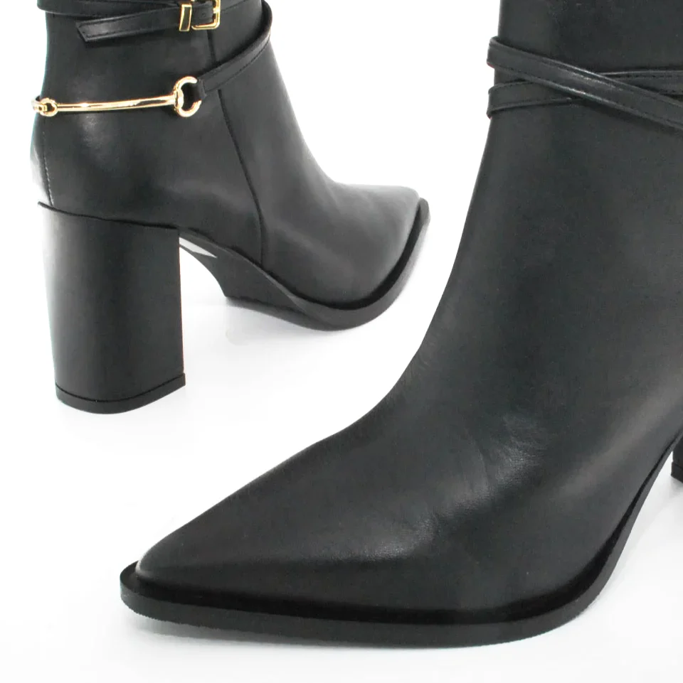 Tomaia in pelle Fodera in pelle Soletta in pelle Suola in gomma antiscivolo Cerniera laterale Tacco rivestito in pelle Applicazione fibbia e sperone dorato Altezza tacco 95 mm Sotto tacco in gomma Qualitร Artigianale Italiana