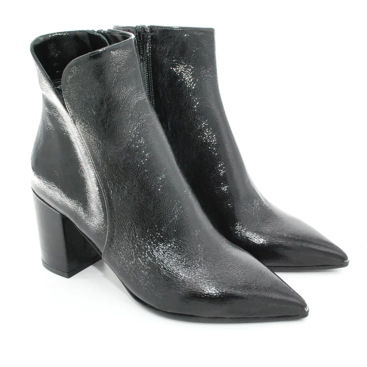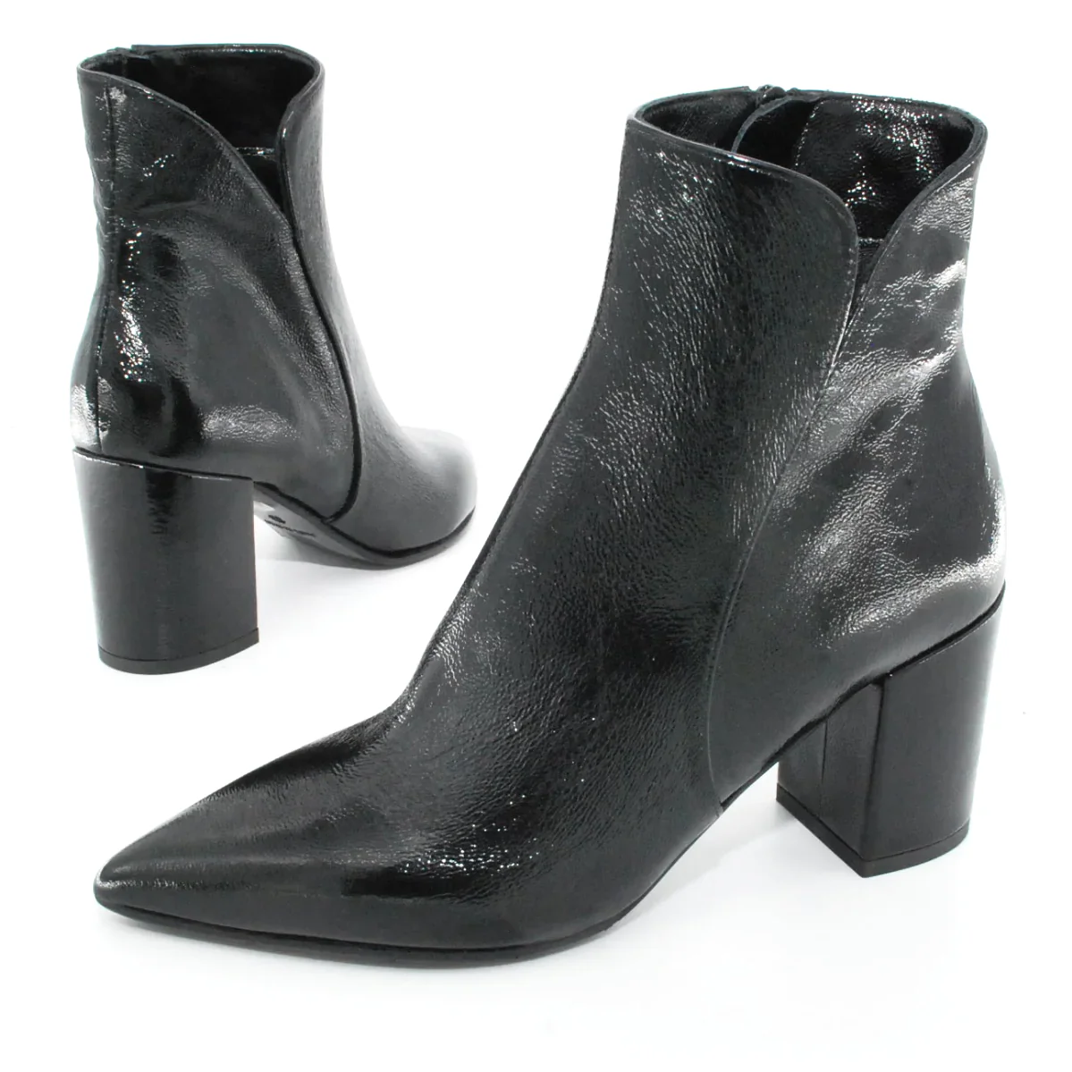 Tomaia in pelle verniciata Fodera in pelle Soletta in pelle Suola in gomma antiscivolo Cerniera laterale Altezza tacco 80 mm Tacco rivestito in pelle Sotto tacco in gomma Qualitร Artigianale Italiana