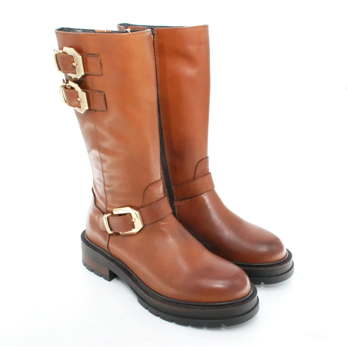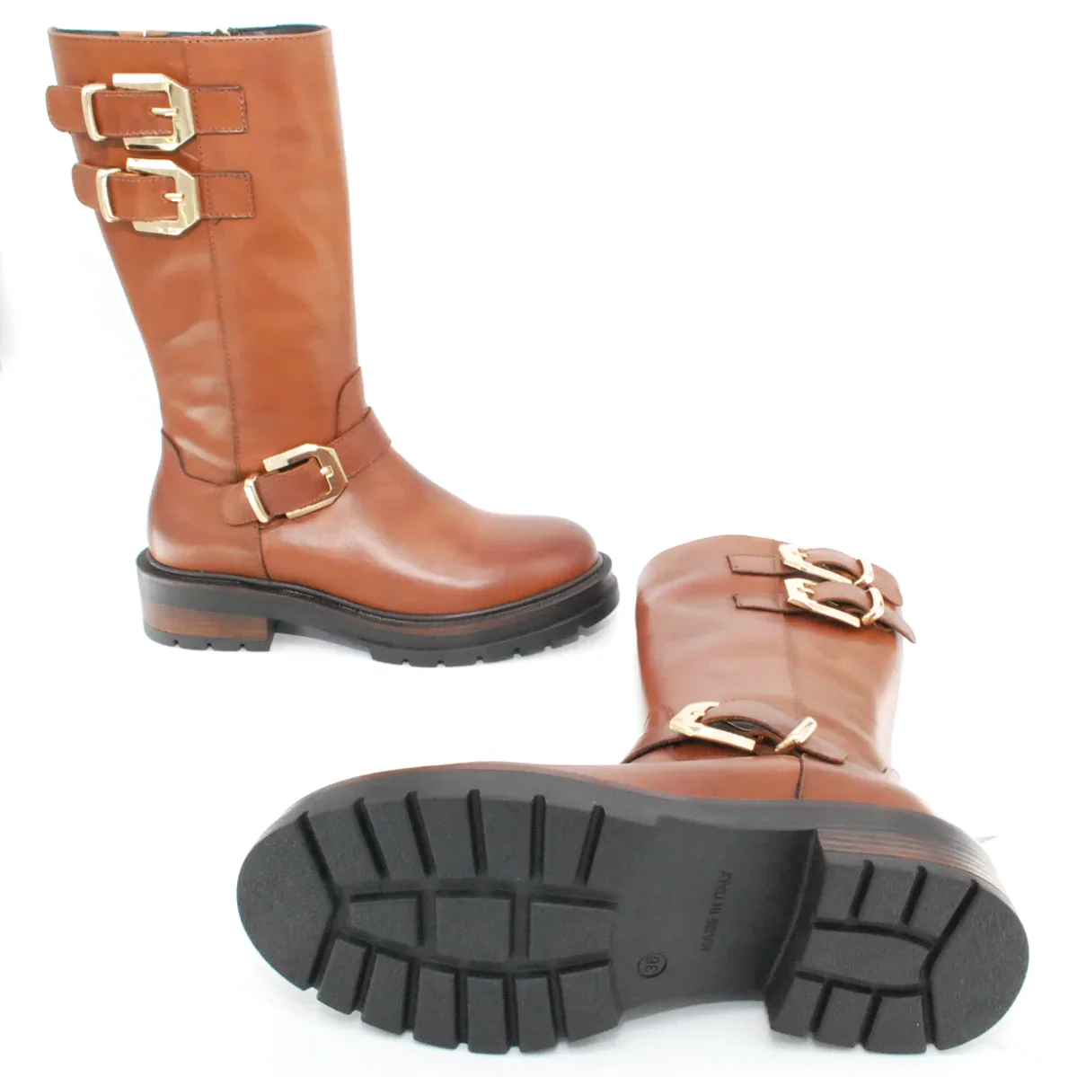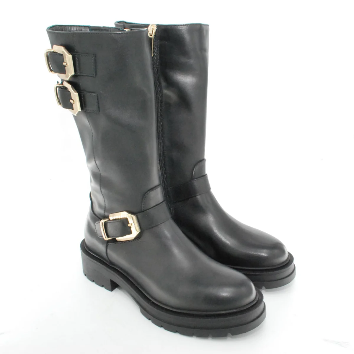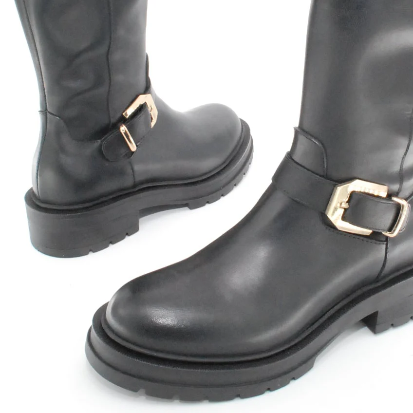 Tomaia in pelle Fodera in pelle Soletta in pelle Applicazioni fibbie dorate Suola in gomma antiscivolo Cerniera laterale Altezza tacco 40 mm Altezza gambale 28 cm Qualitร Artigianale Italiana