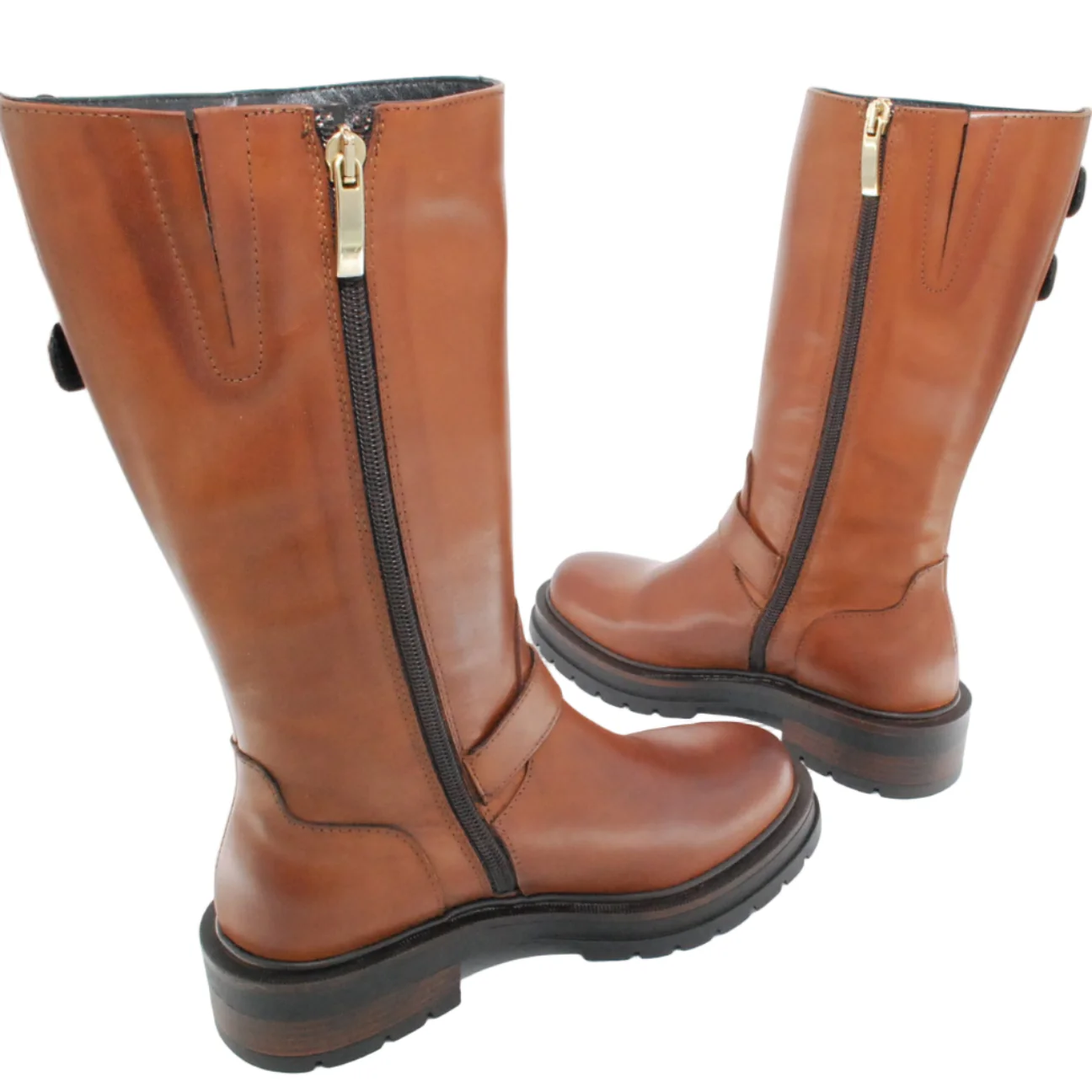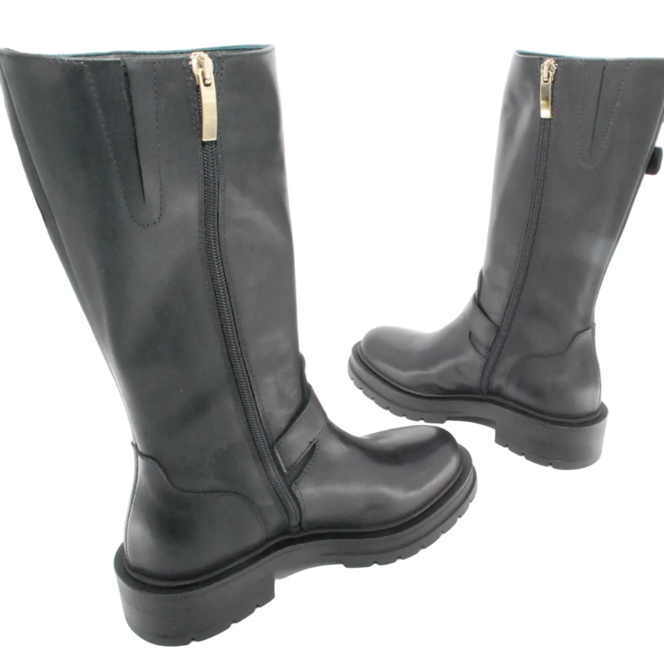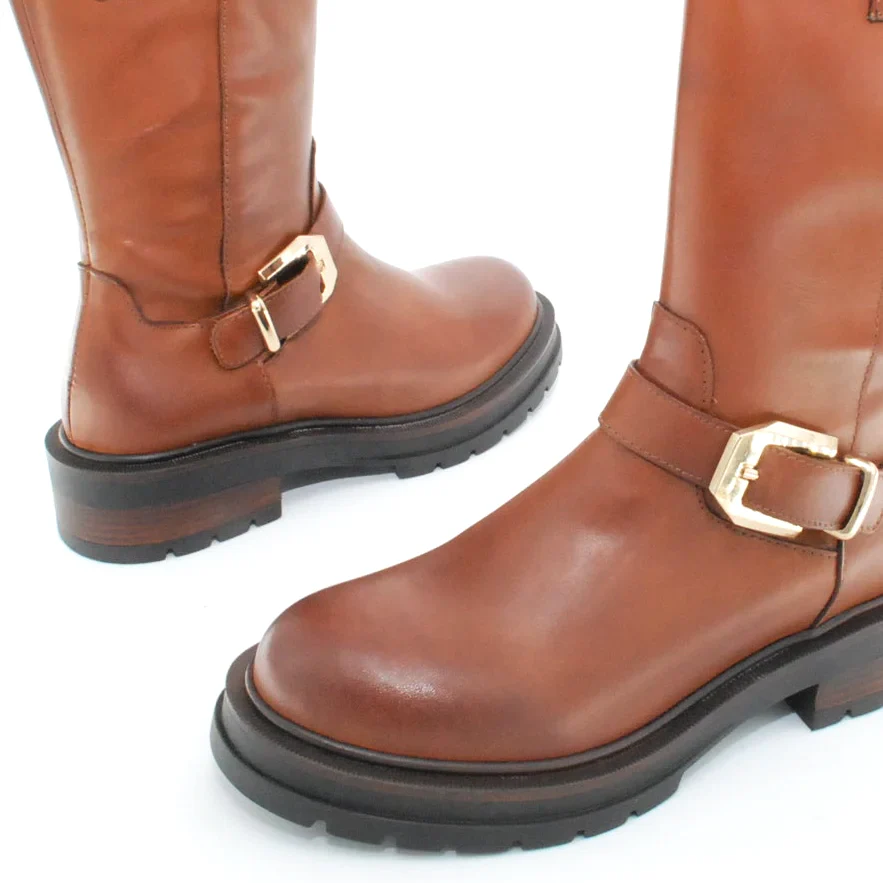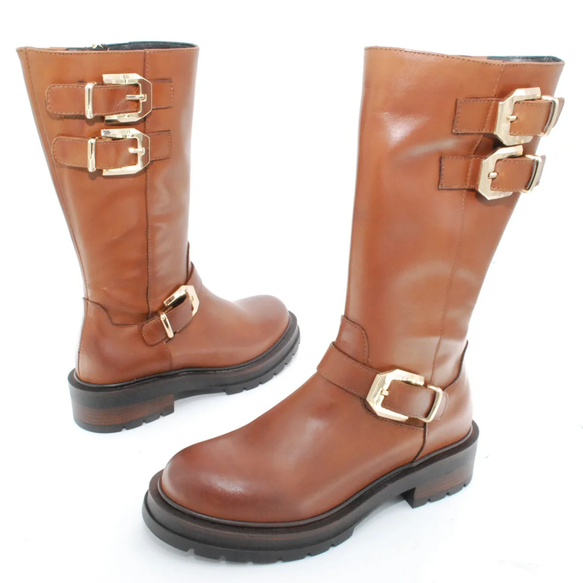 Tomaia in pelle Fodera in pelle Soletta in pelle Applicazioni fibbie dorate Suola in gomma antiscivolo Cerniera laterale Altezza tacco 40 mm Altezza gambale 28 cm Qualitร Artigianale Italiana