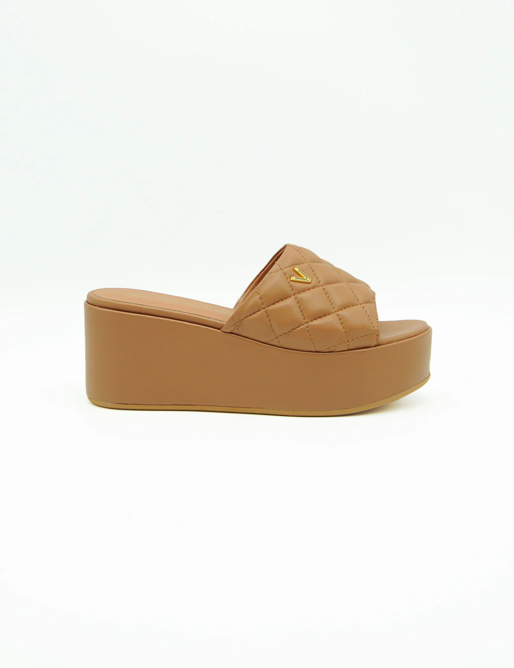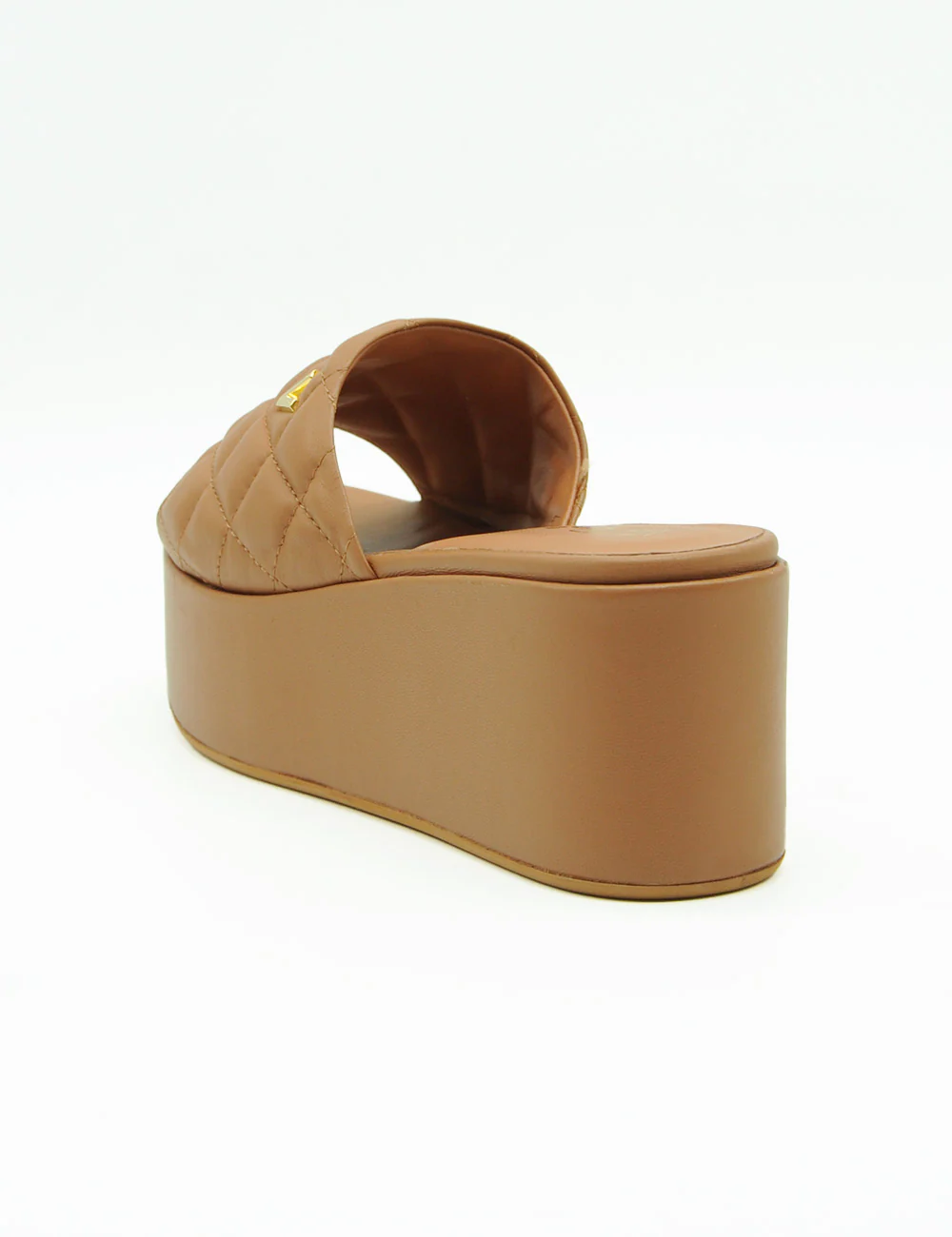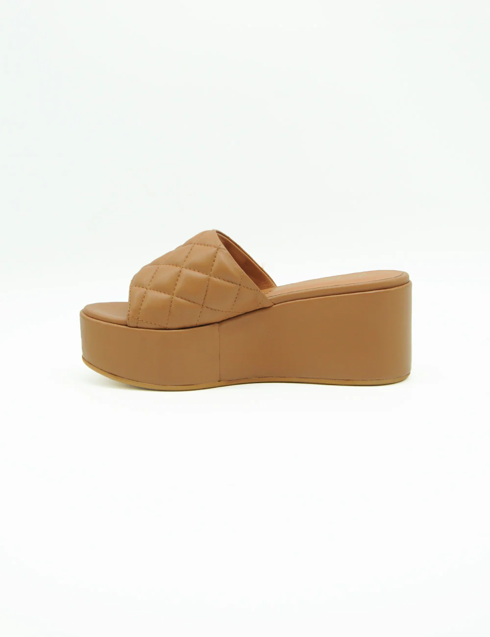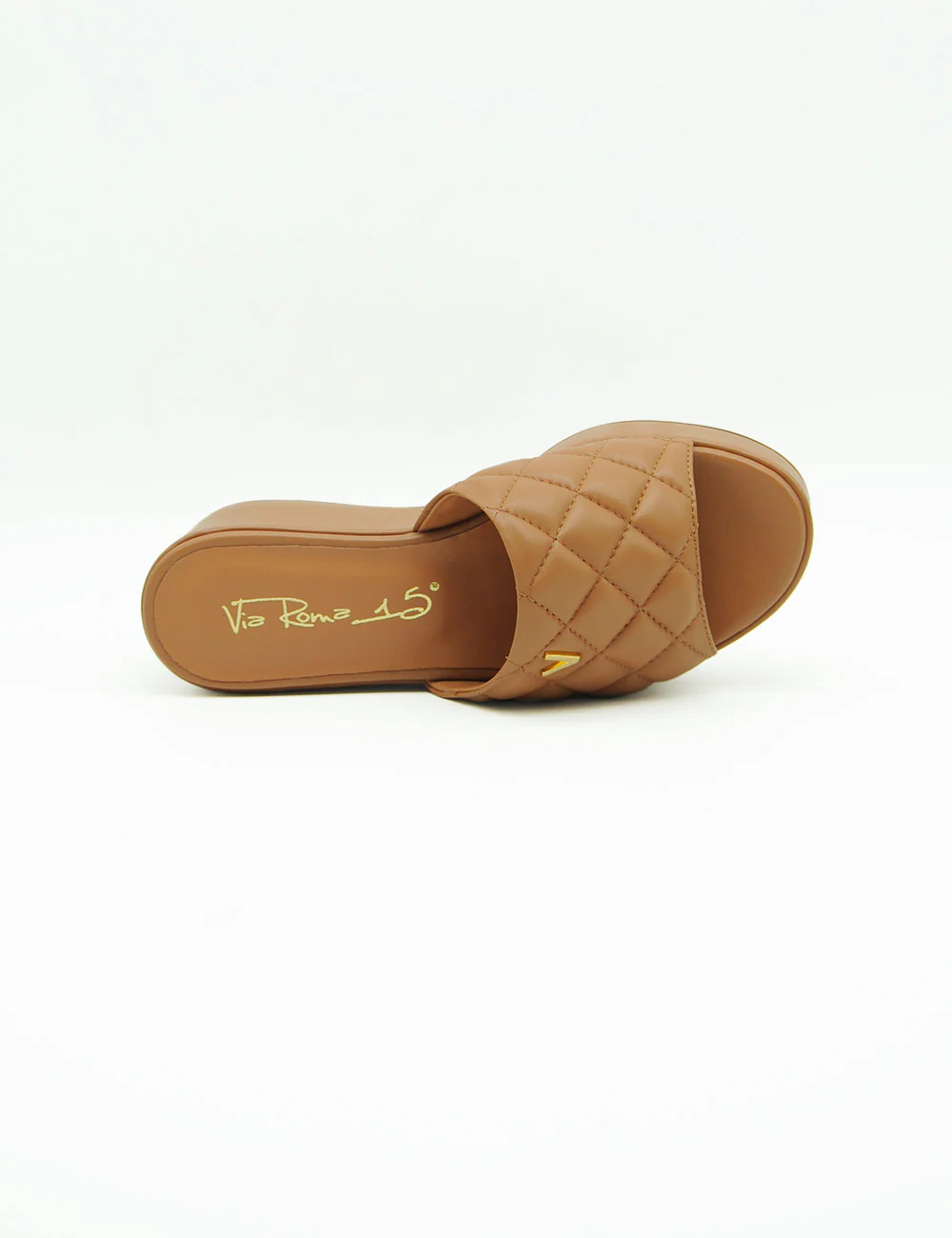 Via Roma 15 Sandalo Caramello, sandalo platform in pelle di alta qualitร a fascia unica imbottita e trapuntata. Morbido sottopiede in pelle. Fondo in gomma. Altezza platform anteriore: 4 cm. Altezza platform posteriore: 7,5 cm