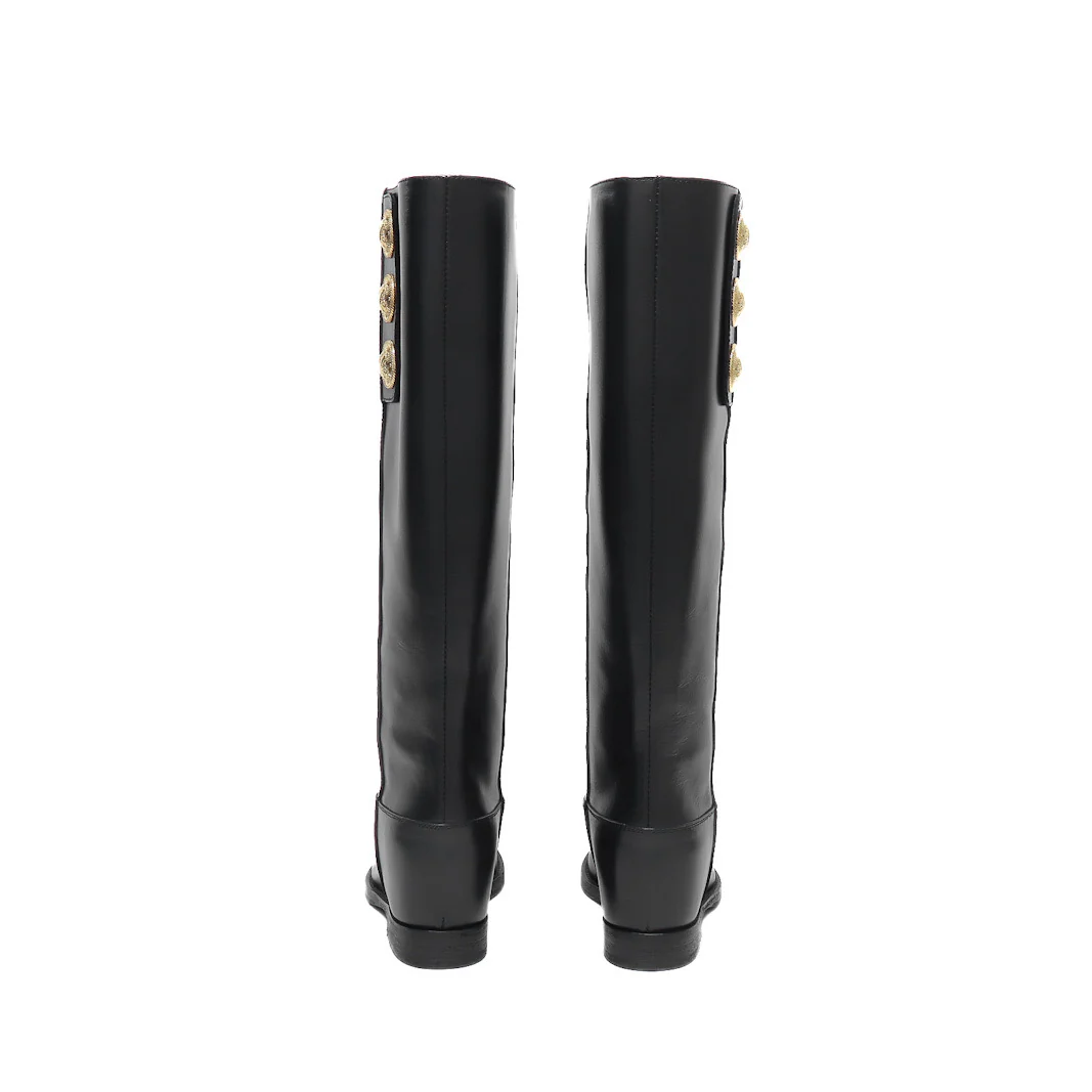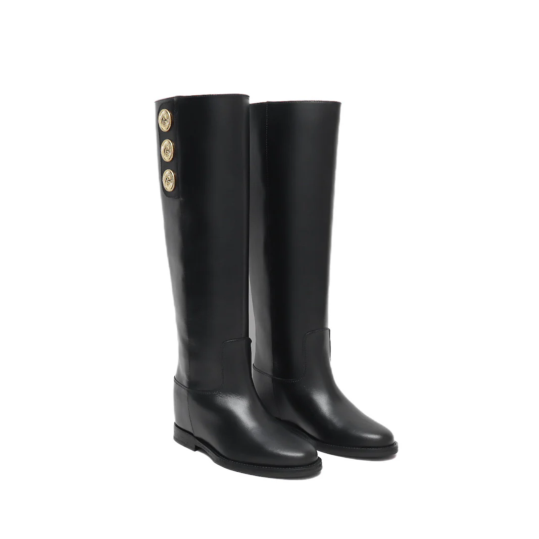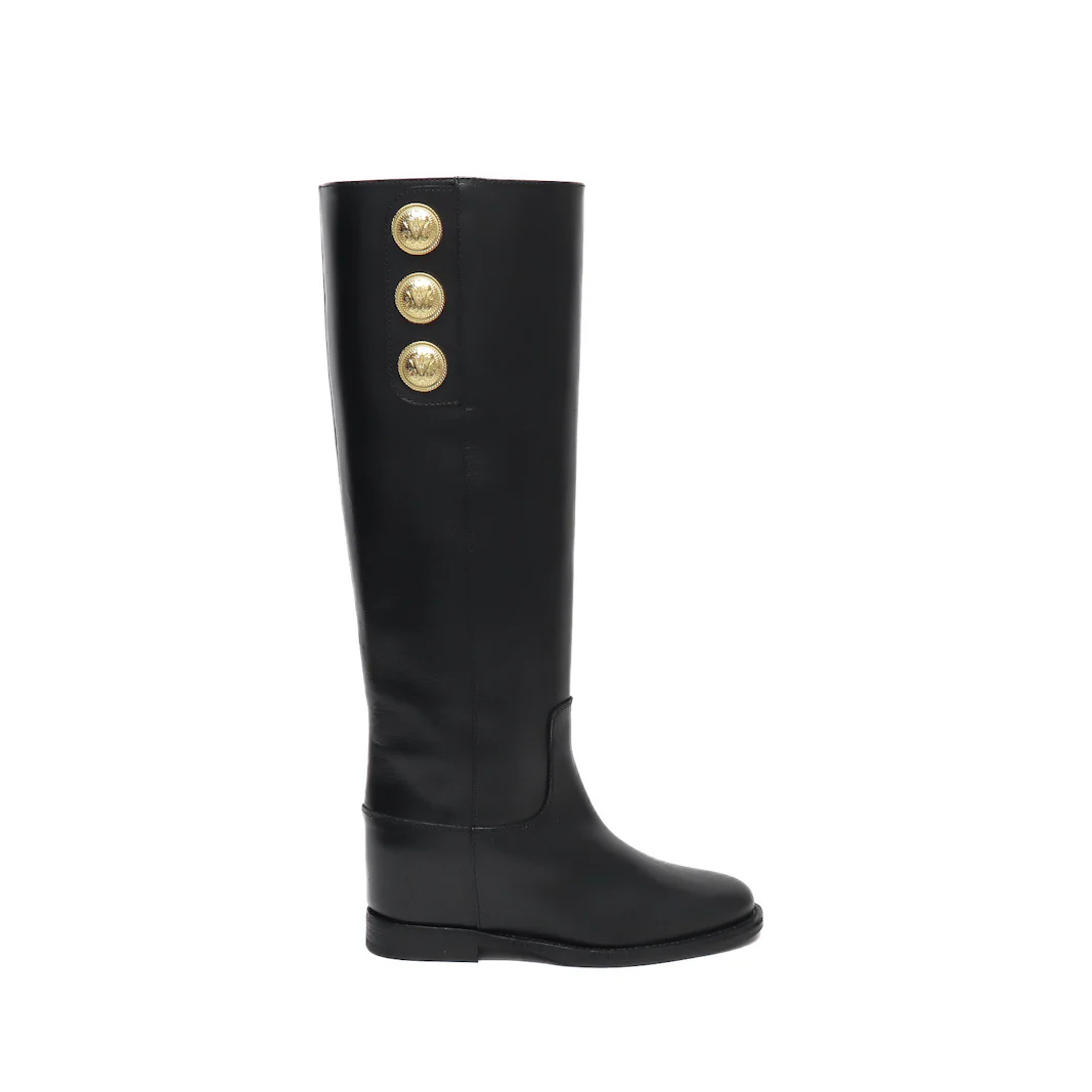Stivale tubolare in vitello nero con bottoni dorati sul lato esterno