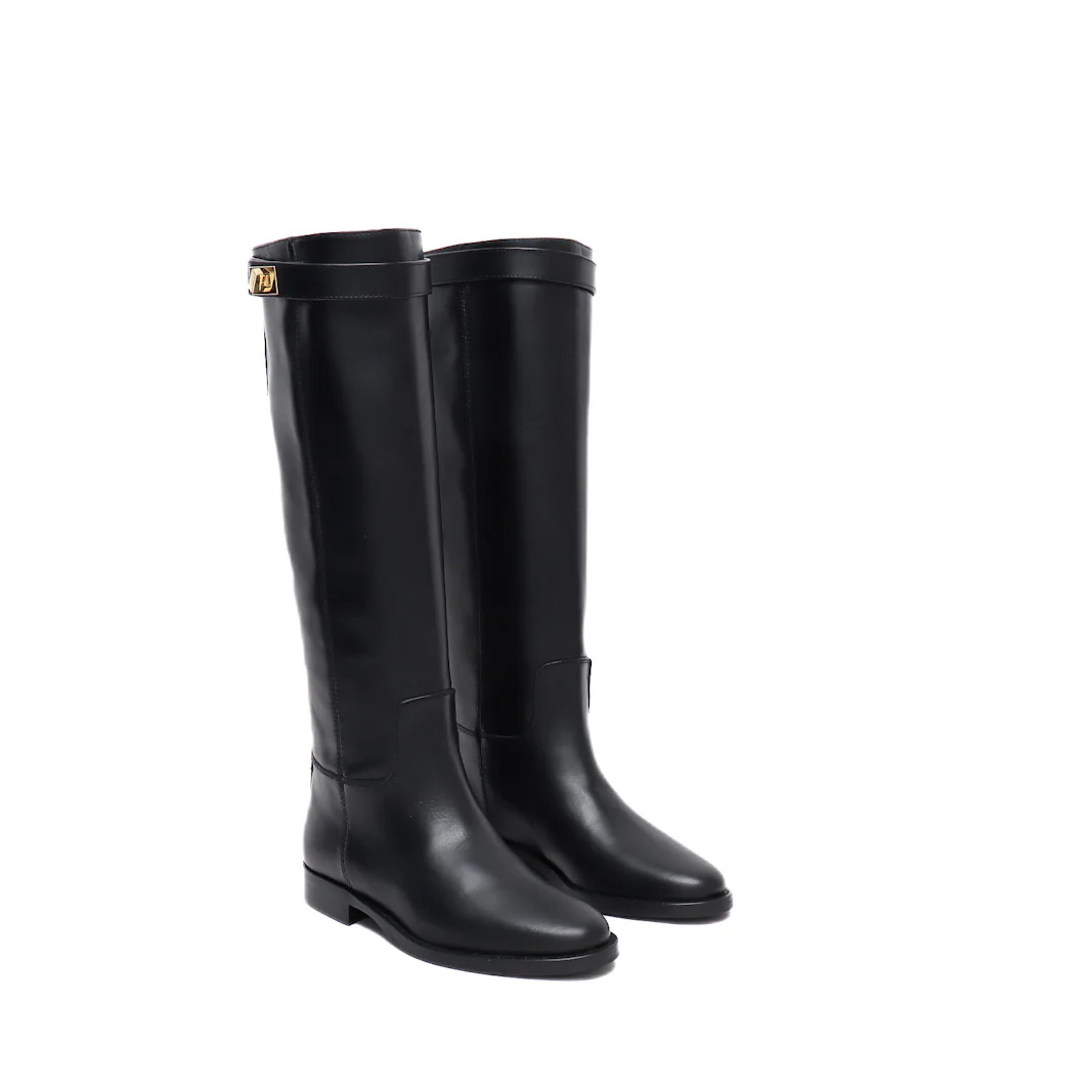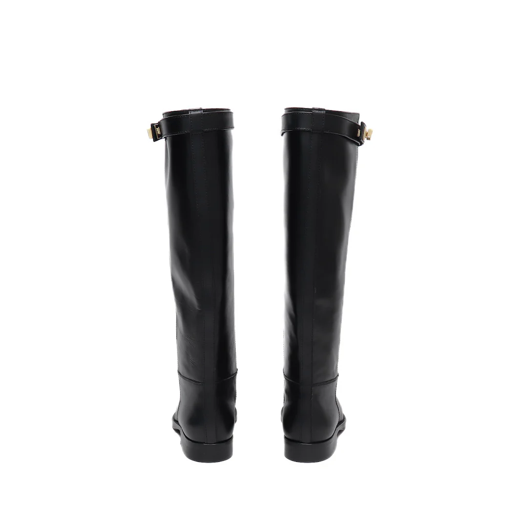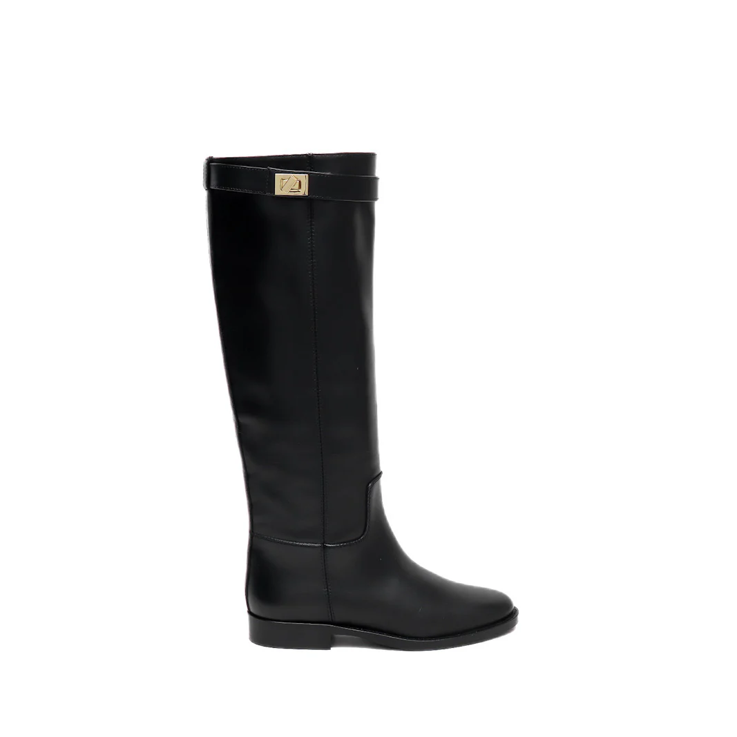 Stivale tubo in pelle nero con cinturino e chiusura in oro, sopra sul polpaccio