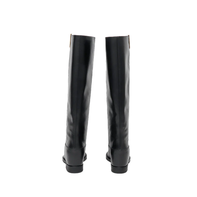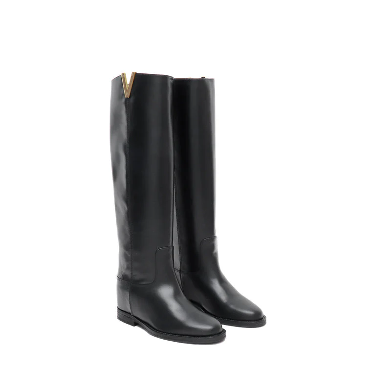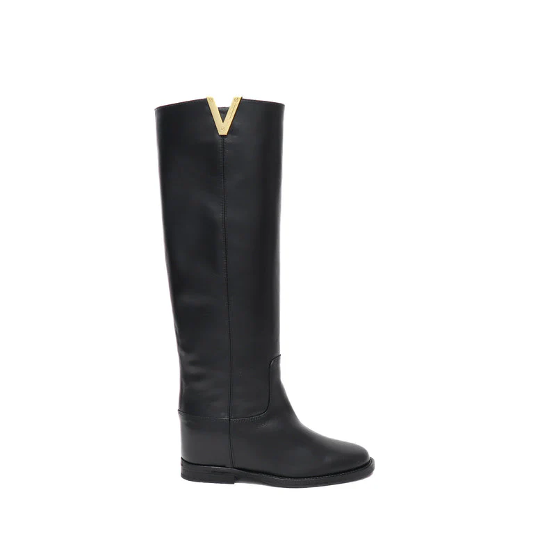 Stivale tubolare in vitello nero con dettaglio dorato ”v” sul lato esterno. TUBOLARE , NO ZIP