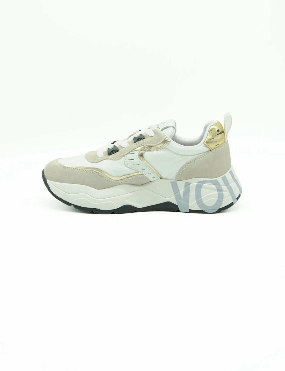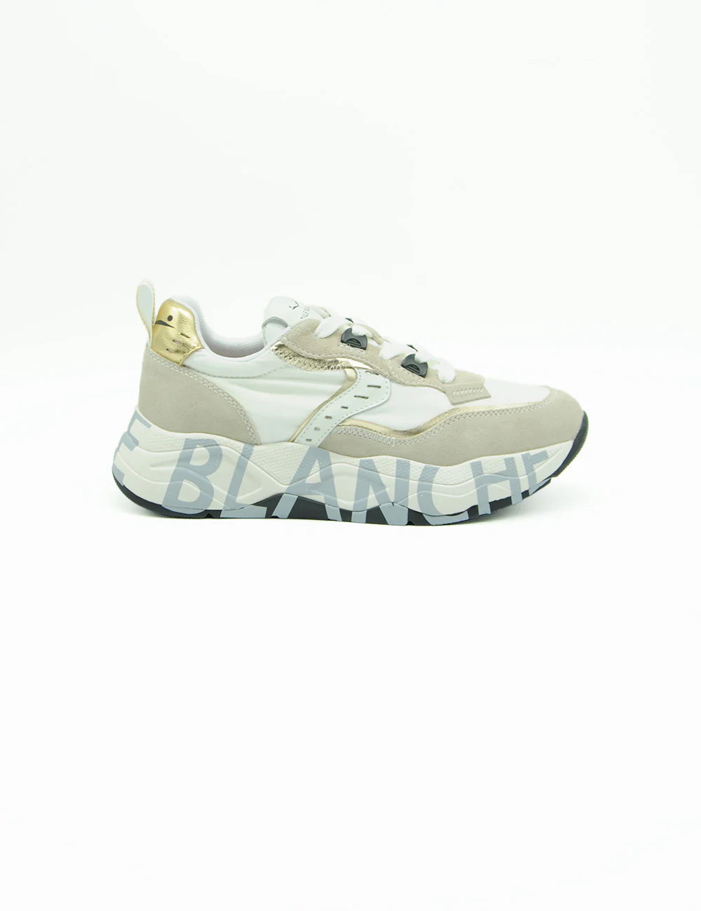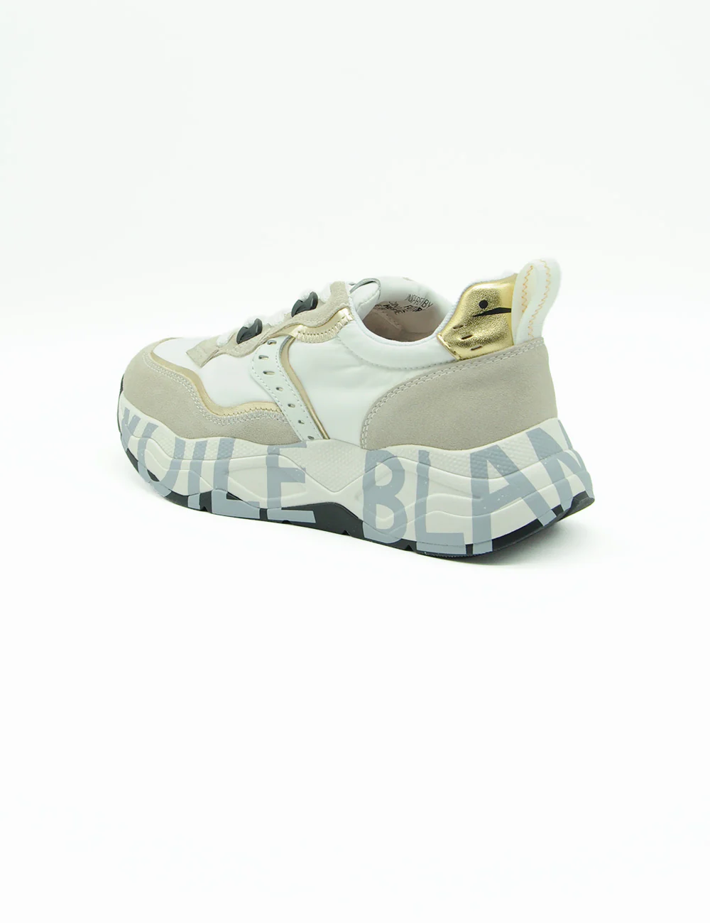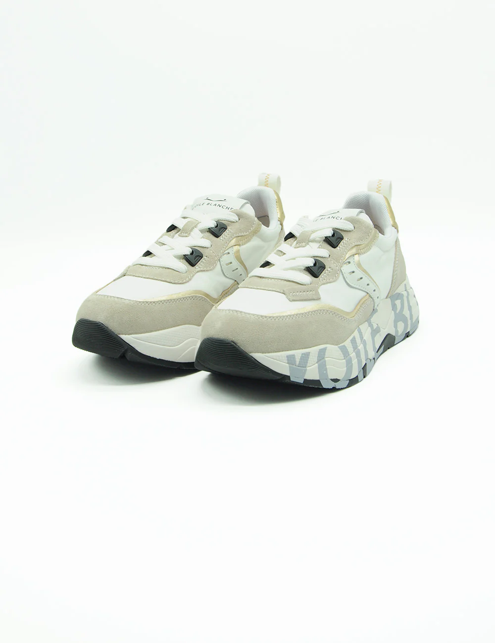 Voile Blanche Sneakers Club105 White Platinum rappresentano lo stile italiano reinventato per la strada contemporanea. Questo modello affascinante combina sapientemente suede beige sabbia, tessuto tecnico bianco crema e dettagli avorio in un design stratificato che cattura l’attenzione. La suola chunky oversize in gomma bicolor con lettering grigio-bluastro stampato in grande scala diventa il vostro statement piece immediato. Linguetta e collar imbottiti garantiscono comfort prolungato, mentre i lacci flat in cotone con tip dorati aggiungono un tocco di raffinatezza discreta. La gomma leggera ammortizzata assicura un passo cushionato che non stanca, perfetto per chi non scende a compromessi tra eleganza senza tempo e praticitร urbana.