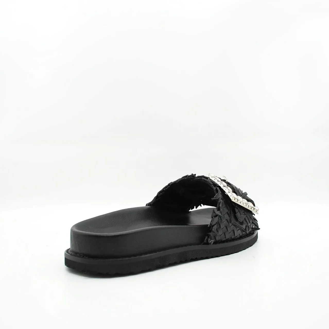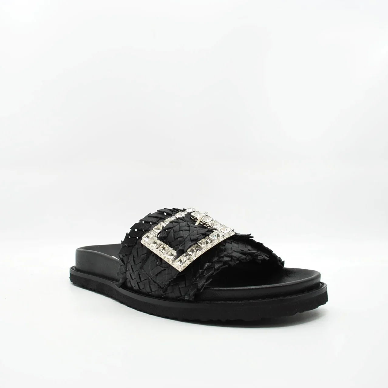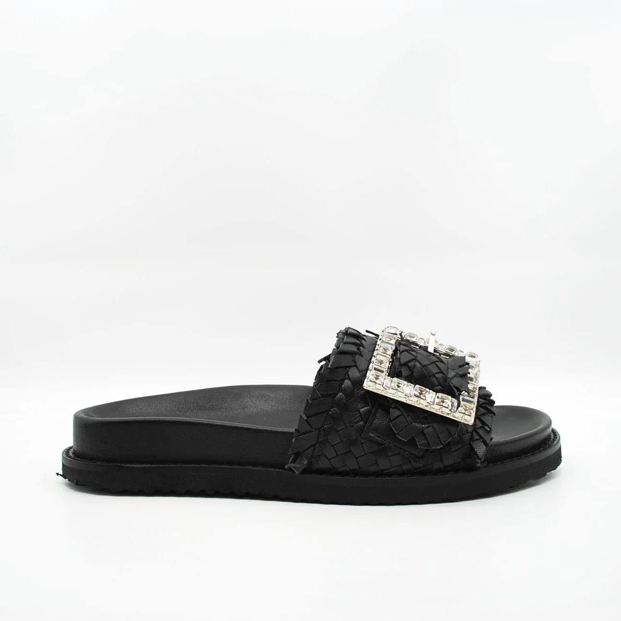 Zeppa in pelle intrecciatafodera in pelle fondo in gomma extralight antiscivolosuoletta imbottita in pelle zeppa 30 mm applicazione pietrefascia regolabile con fibbia