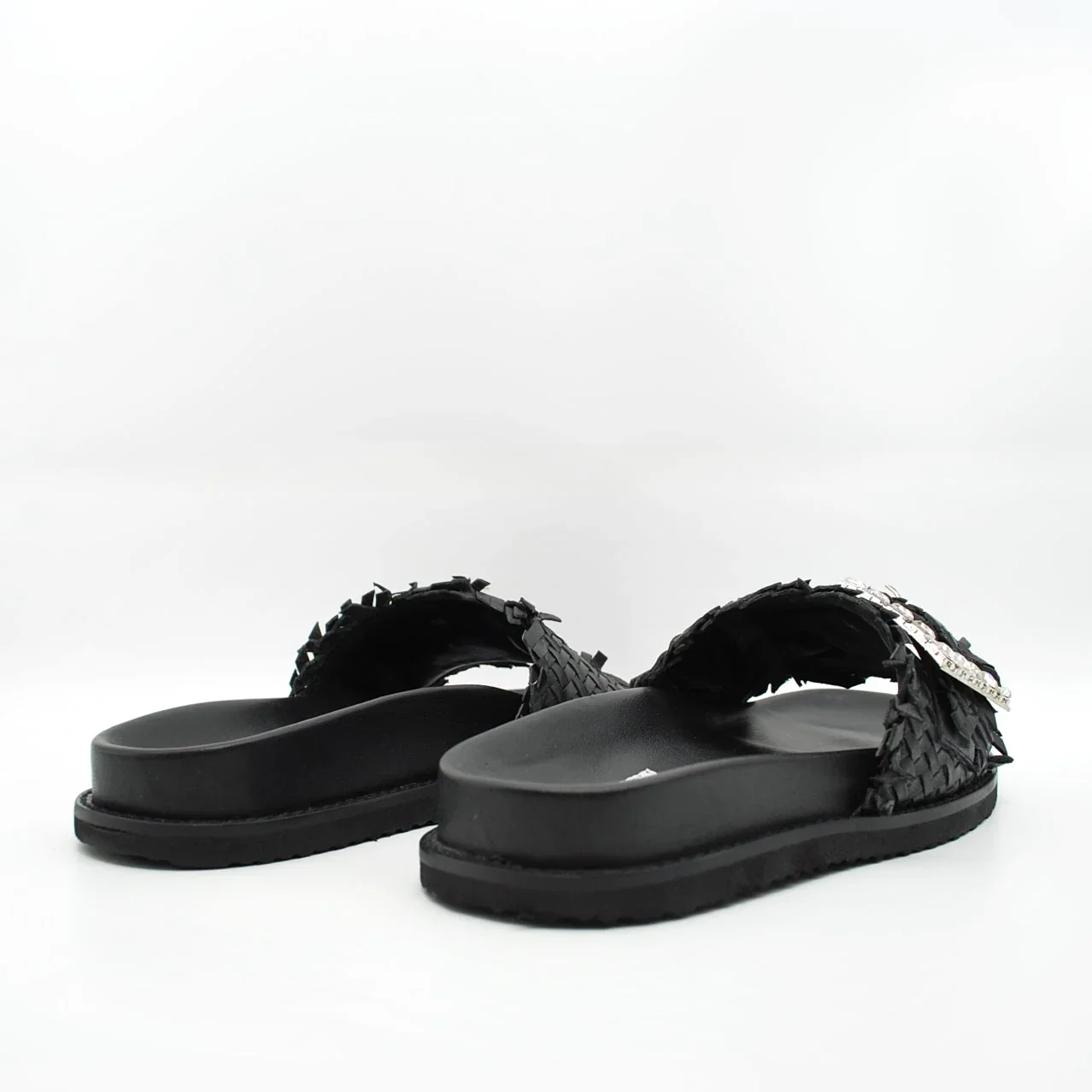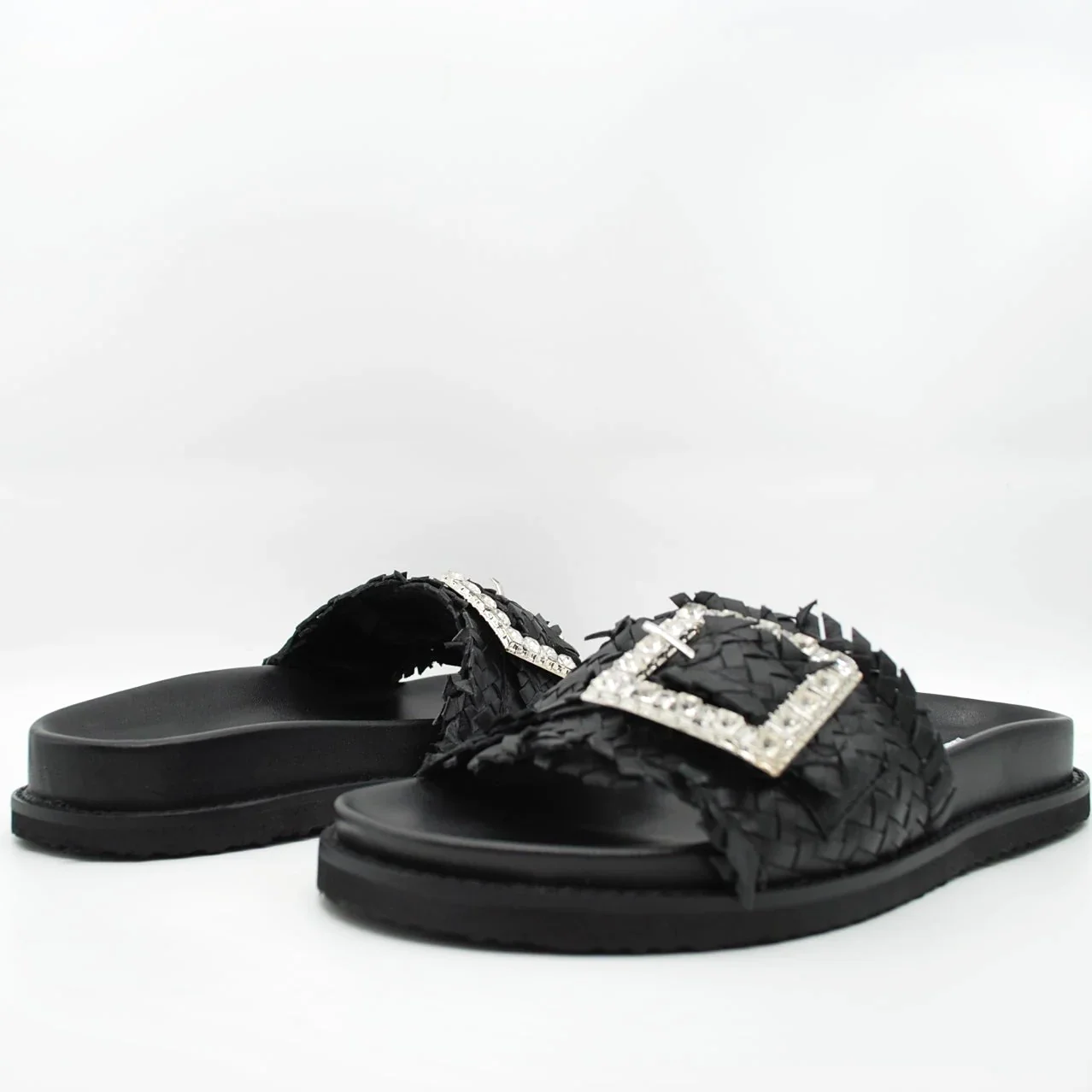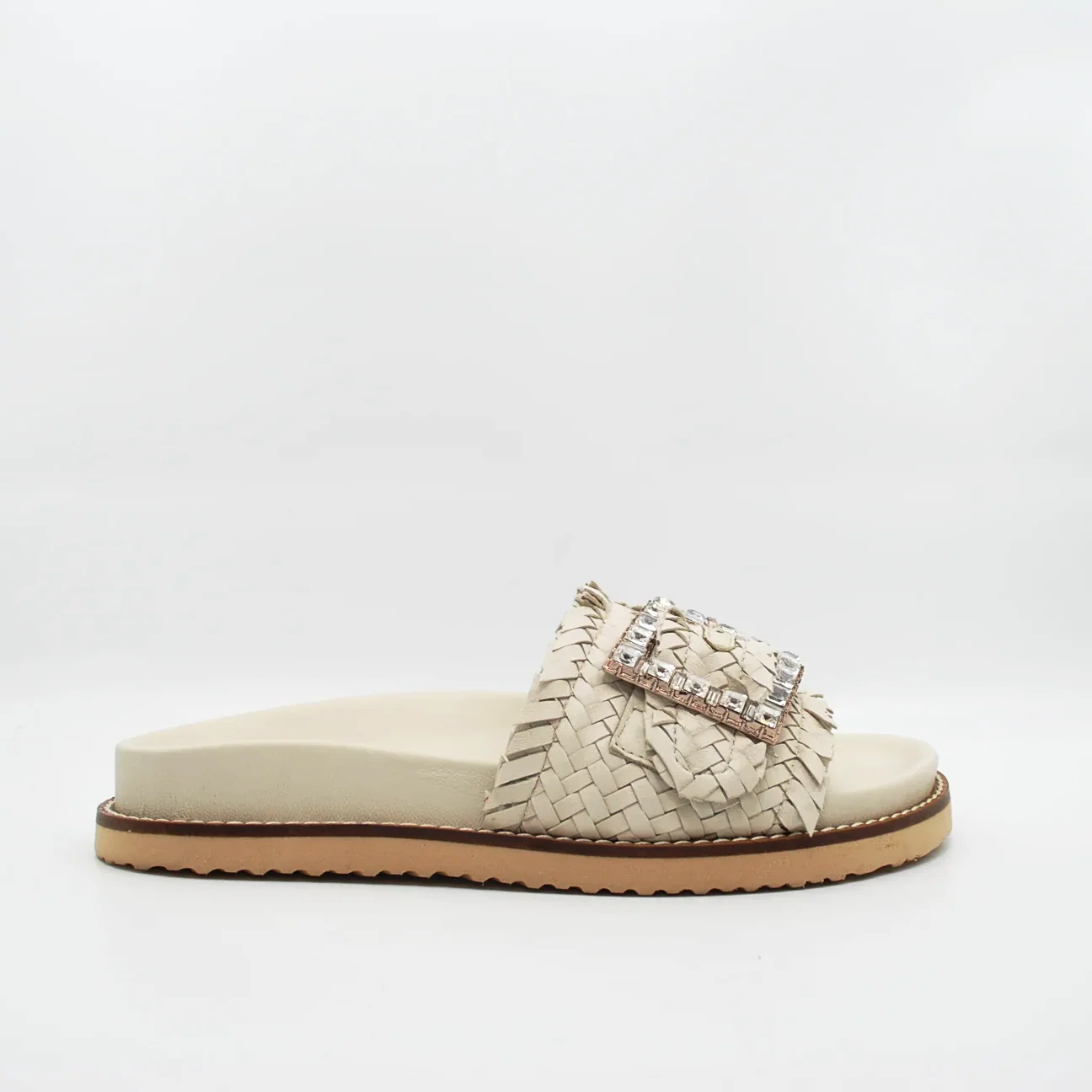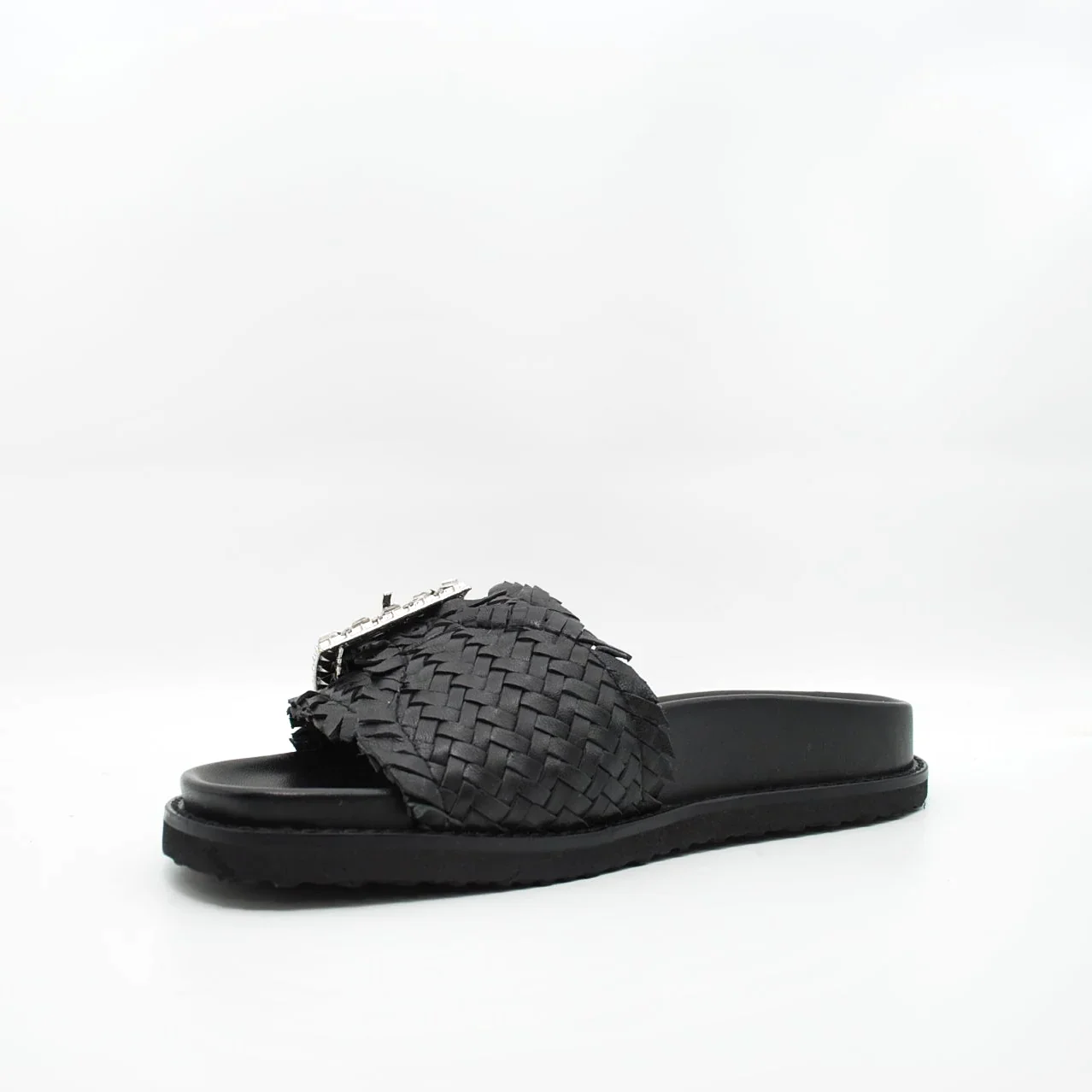 Zeppa in pelle intrecciatafodera in pelle fondo in gomma extralight antiscivolosuoletta imbottita in pelle zeppa 30 mm applicazione pietrefascia regolabile con fibbia