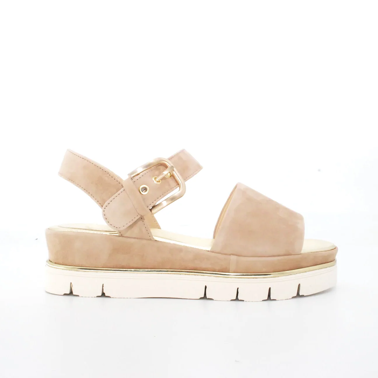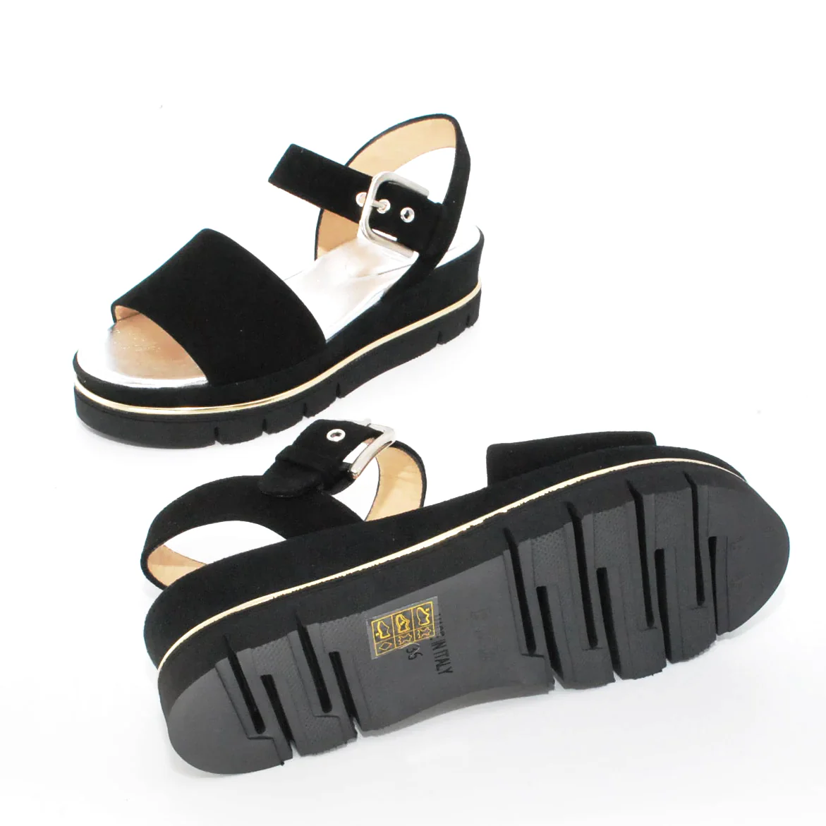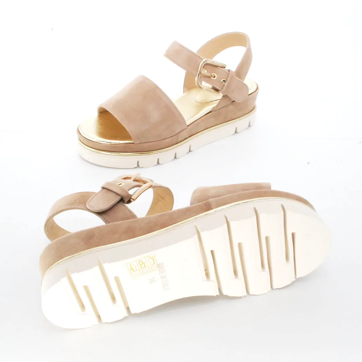 Tomaia in camoscio Fodera in pelle Soletta in pelle Chiusura con fibbia regolabile Suola flessibile in gomma antiscivolo zeppa rivestita in camoscio Altezza zeppa 50 mm Qualitร artigianale Italiana