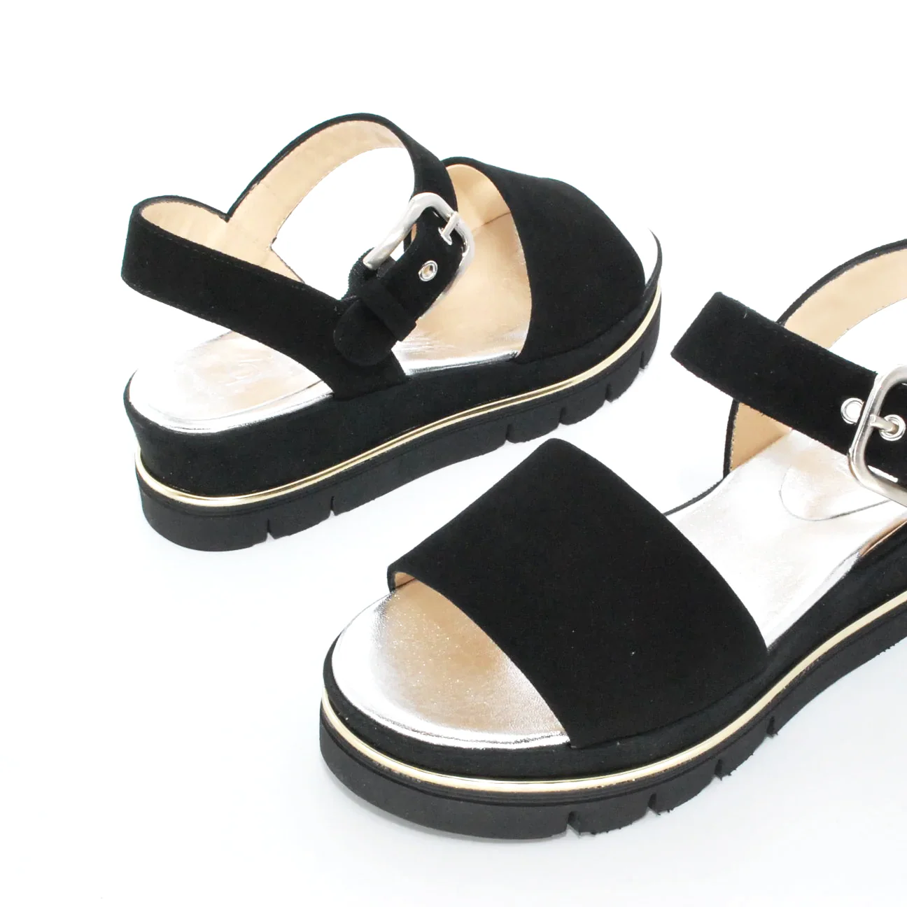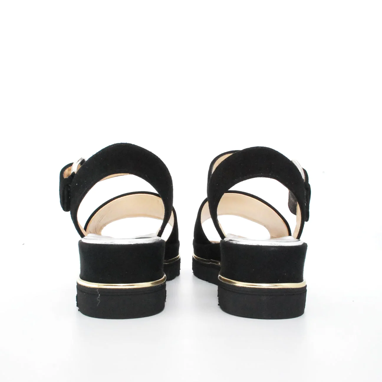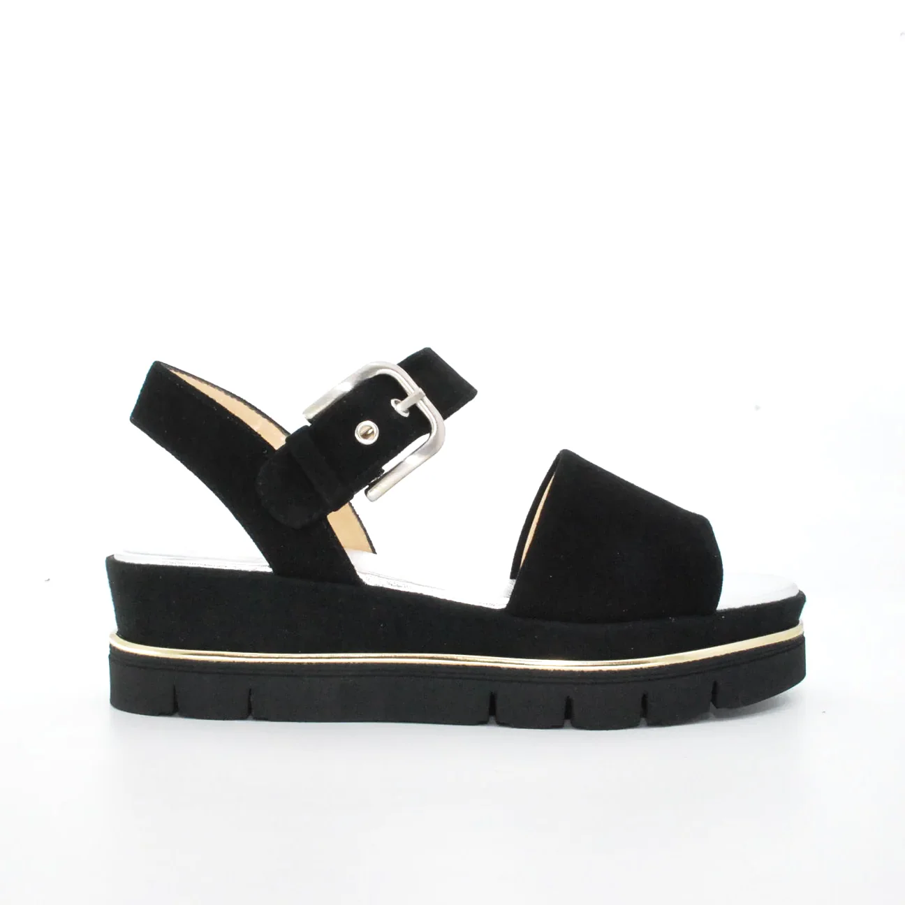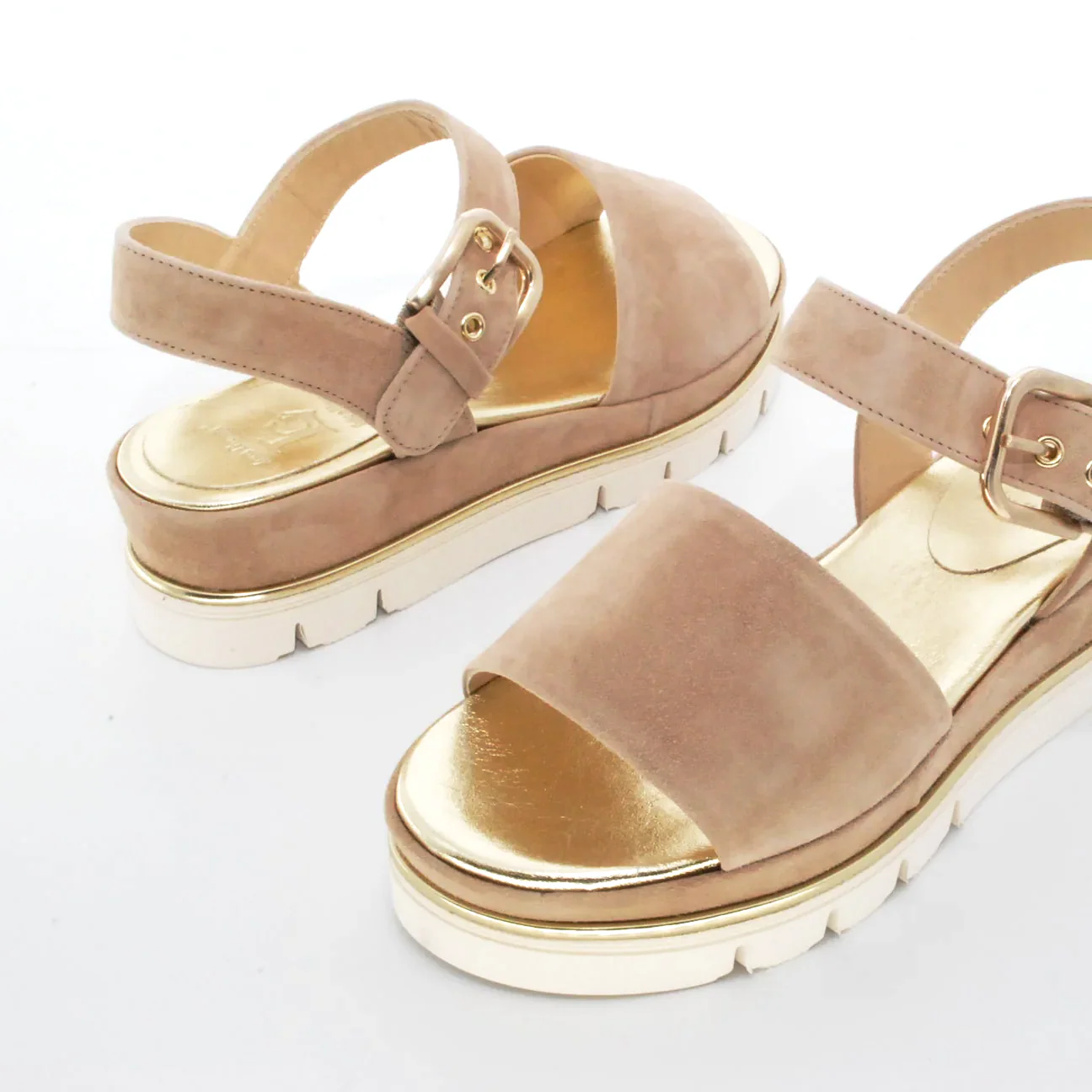 Tomaia in camoscio Fodera in pelle Soletta in pelle Chiusura con fibbia regolabile Suola flessibile in gomma antiscivolo zeppa rivestita in camoscio Altezza zeppa 50 mm Qualitร artigianale Italiana