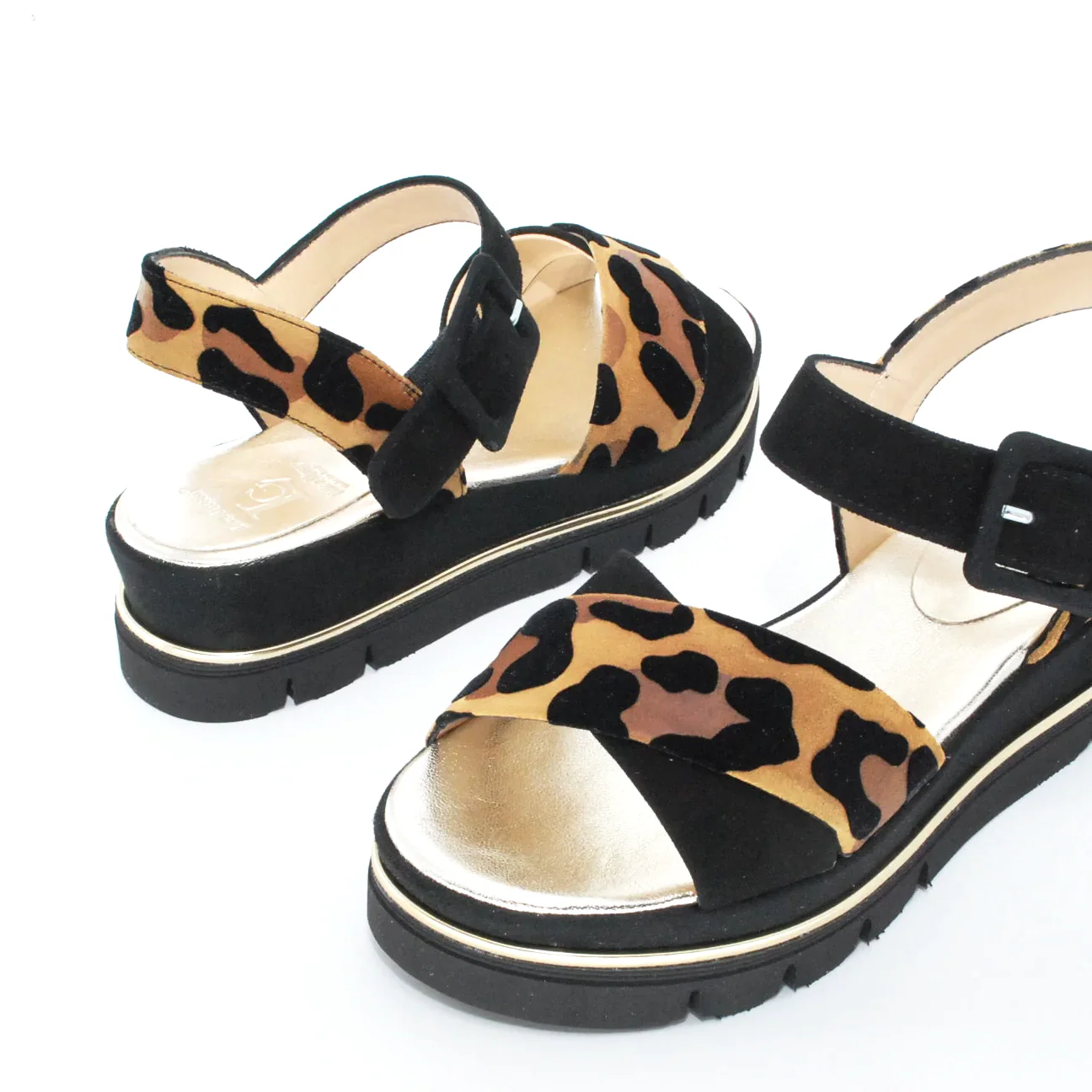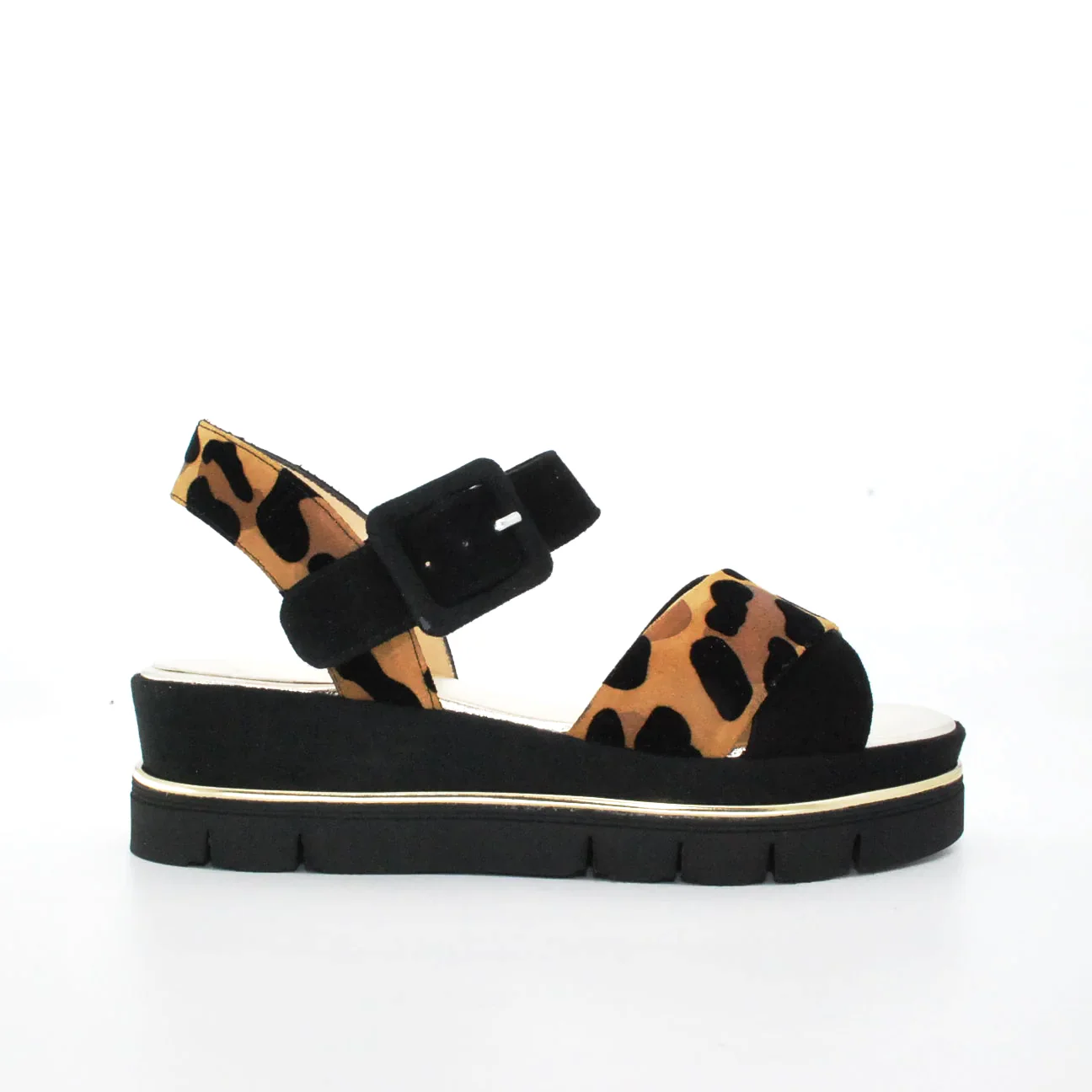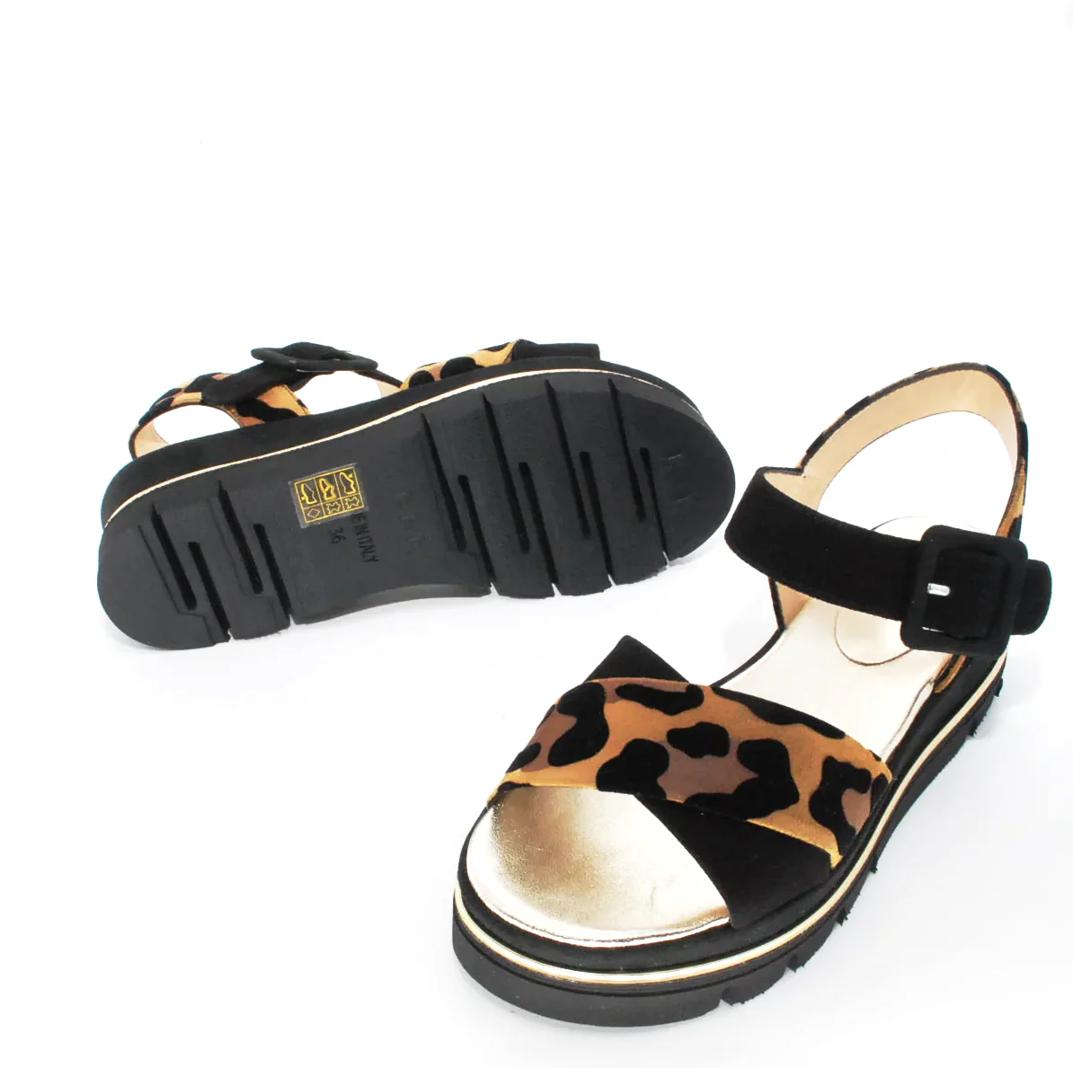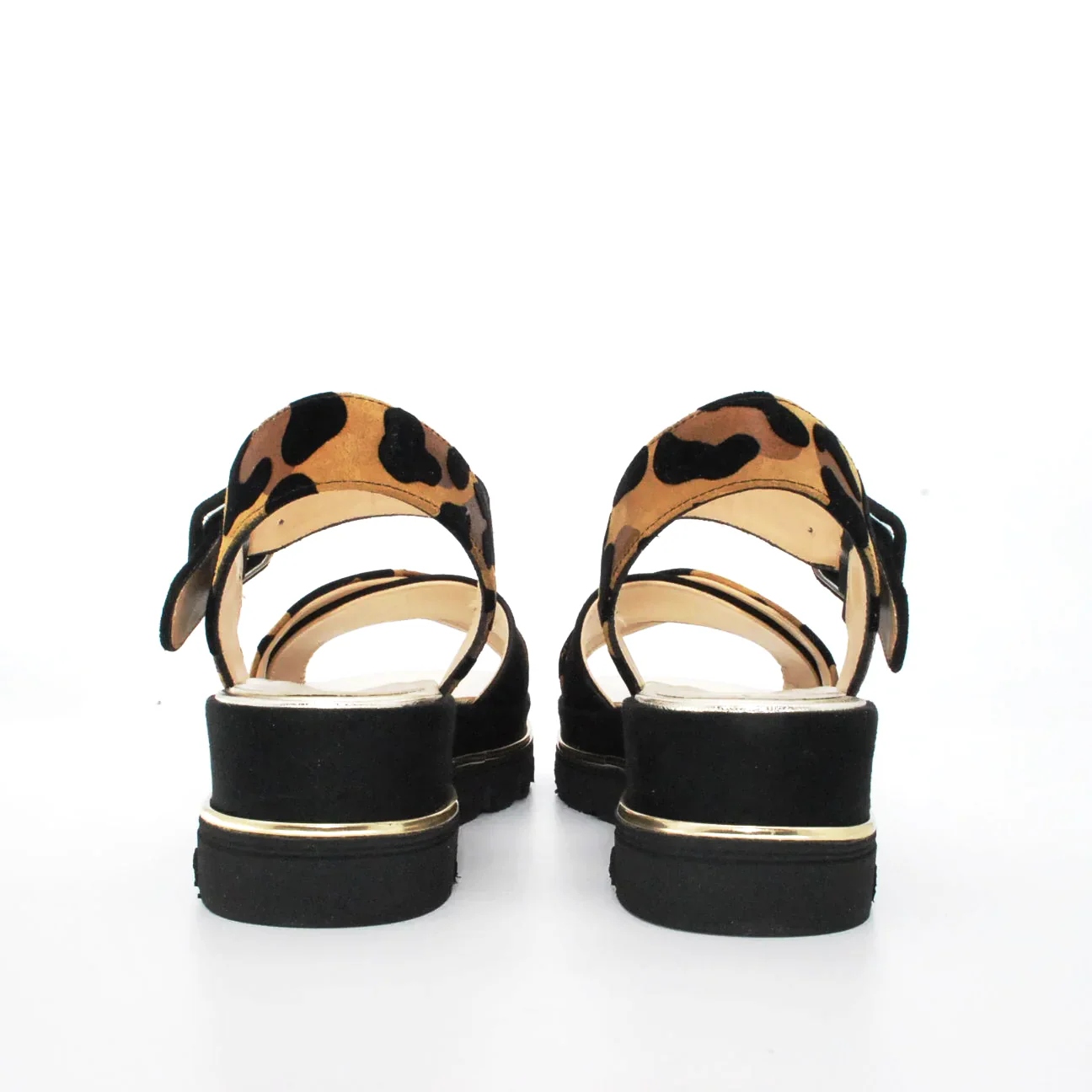 Tomaia in camoscio Fodera in pelle Soletta in pelle Chiusura con fibbia regolabile Suola flessibile in gomma antiscivolo Zeppa rivestita in camoscio Applicazioni: riporto pelle leopard Altezza zeppa 50 mm Qualitร artigianale Italiana