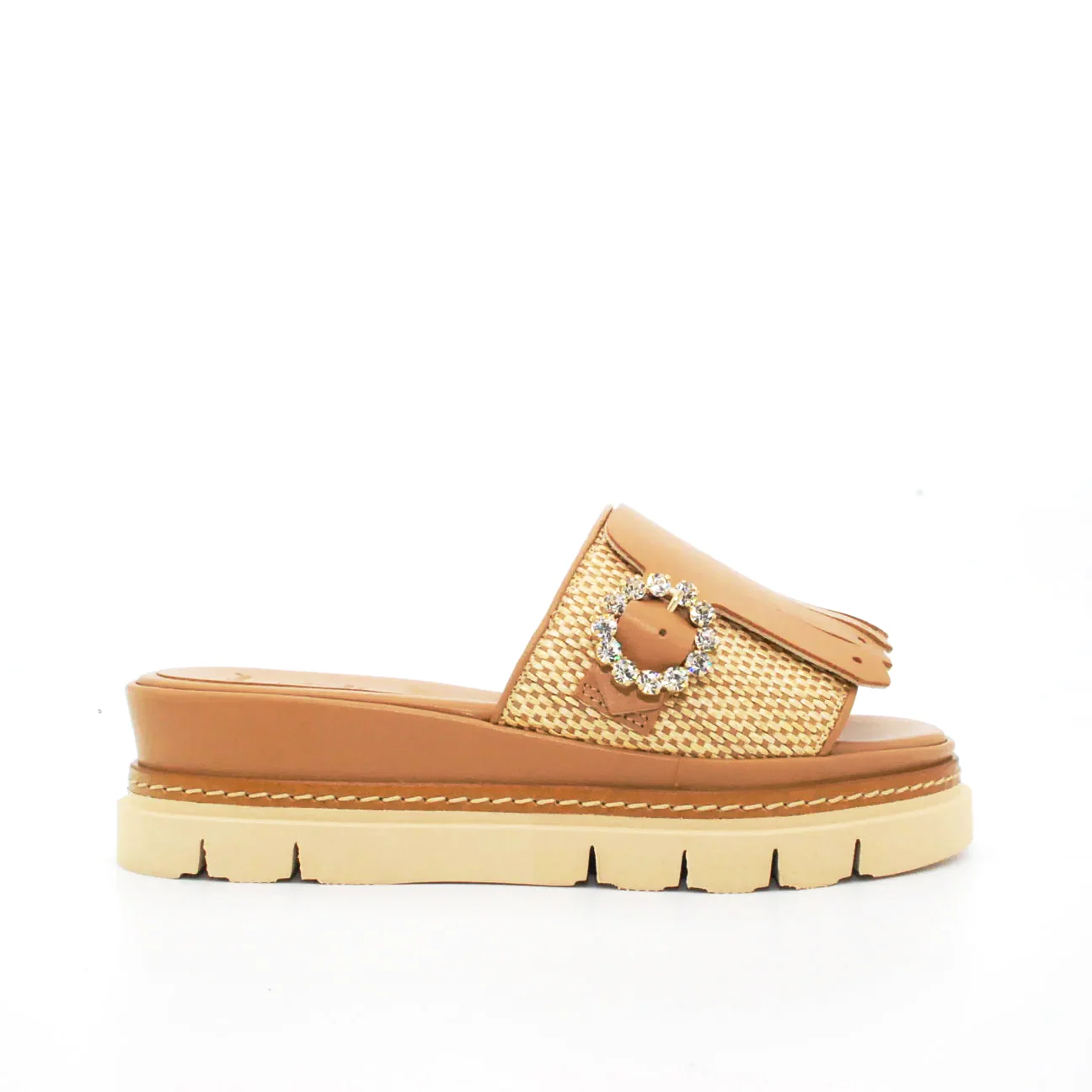 Tomaia pelle e vimini intrecciata Fodera in pelle Soletta in pelle Applicazione fibbia con strass Zeppa rivestita in pelle Suola flessibile in gomma antiscivolo Altezza zeppa 50 mm Qualitร artigianale Italiana
