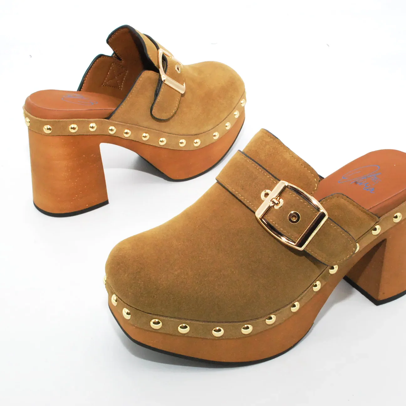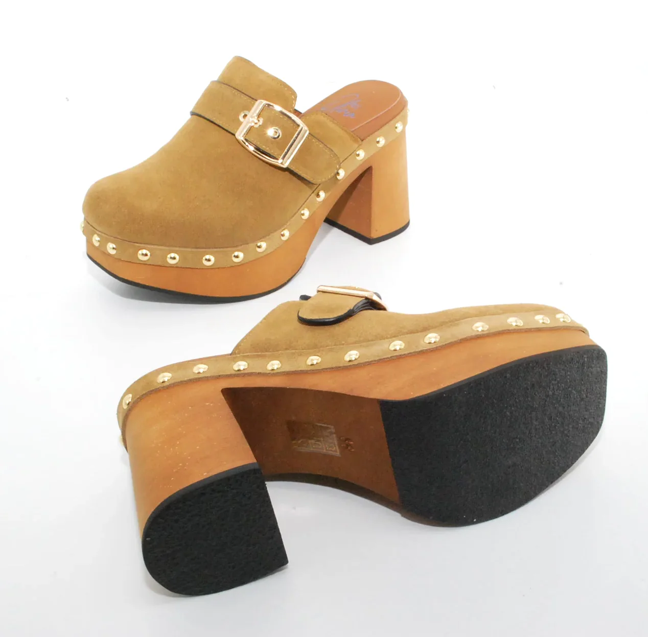 Tomaia in camoscio Fodera in pelle Soletta in pelle Chiusura regolabile con fibbia Suola in gomma antiscivolo Altezza tacco 90 mm Altezza plateau 40 mm Sotto tacco in gomma